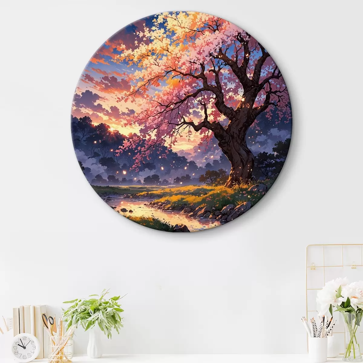 Кругла картина Дерево з рожевими квітами, яке перетинає річка Nr r38645