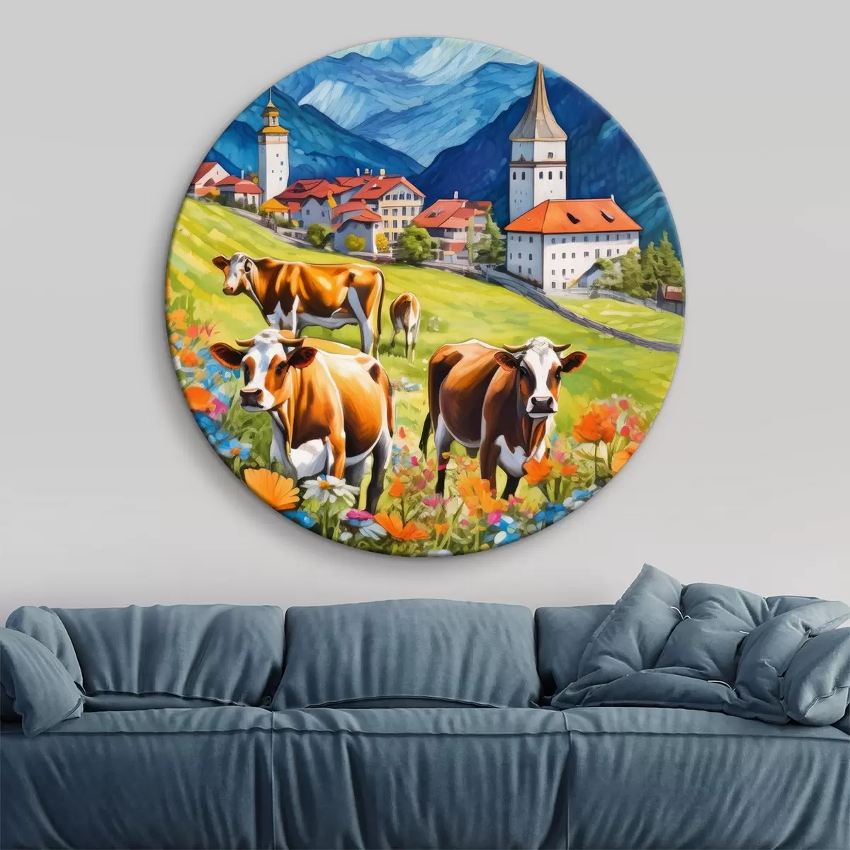 Кругла картина Корови на лузі з квітами в Альпійських горах Nr r38808