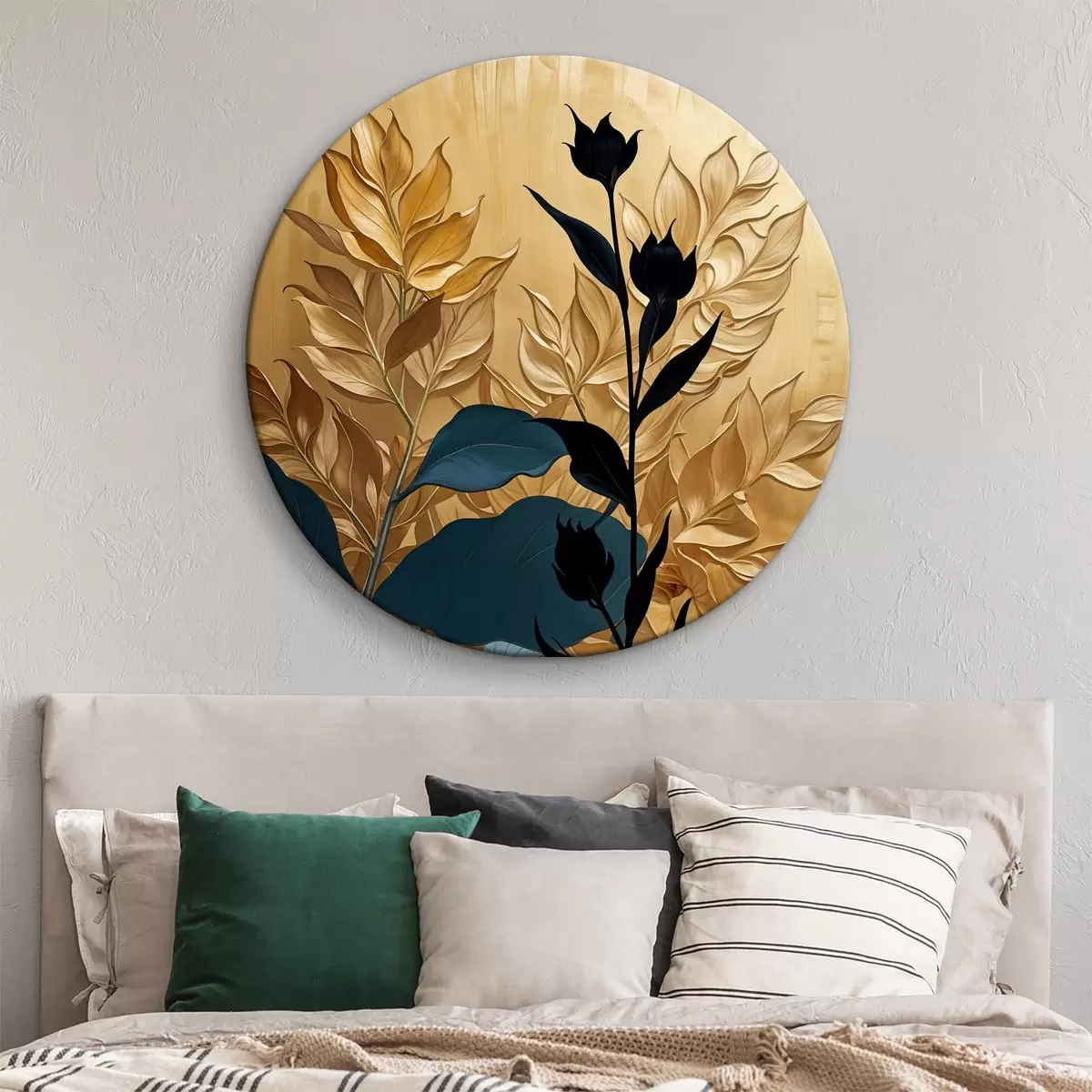 Кругла картина Абстрактна квіткова композиція з великим листям і темними силуетними формами r38822