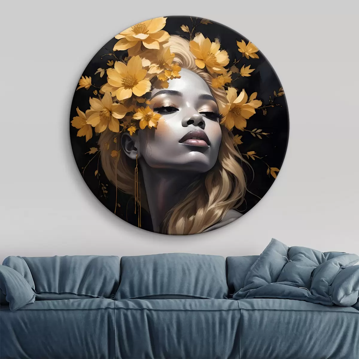 Кругла картина Портрет молодої жінки в оточенні жовтого осіннього листя на темному тлі Nr r38834