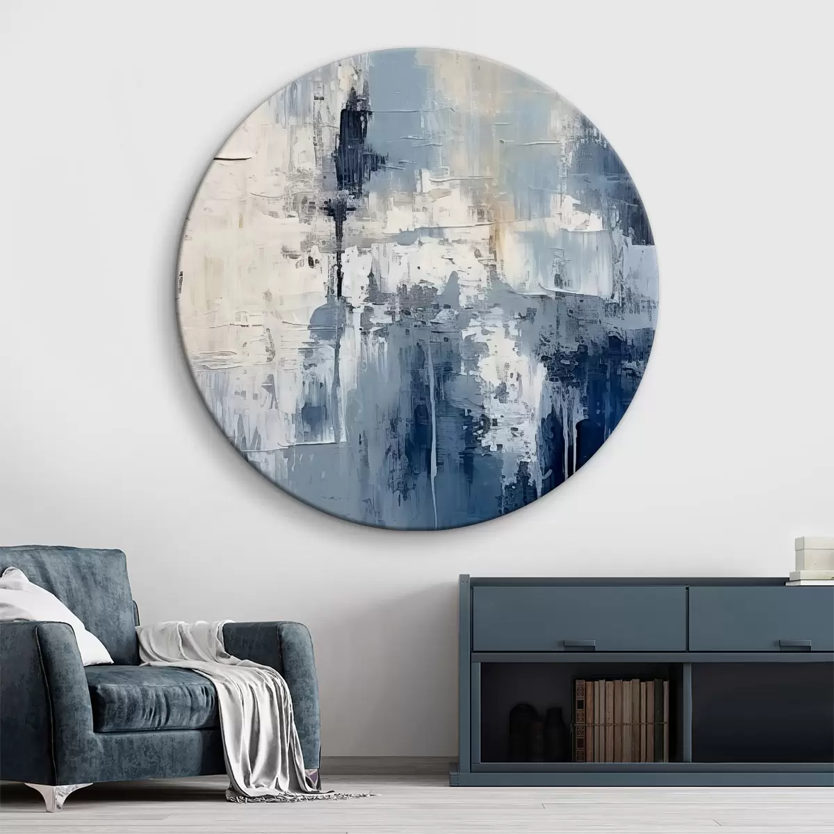 Кругла картина Абстрактний мінімалістичний олійний живопис, потертий, геометричний, пляма, синьо-білий колір r38906
