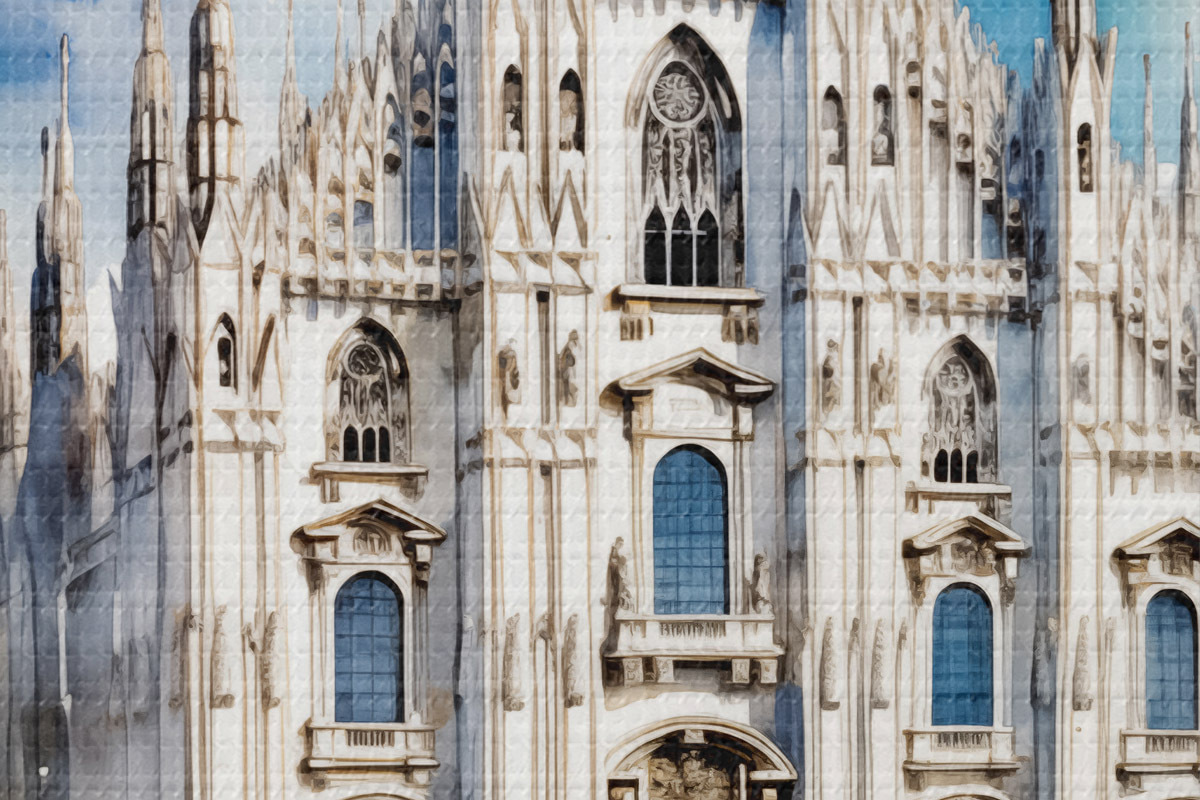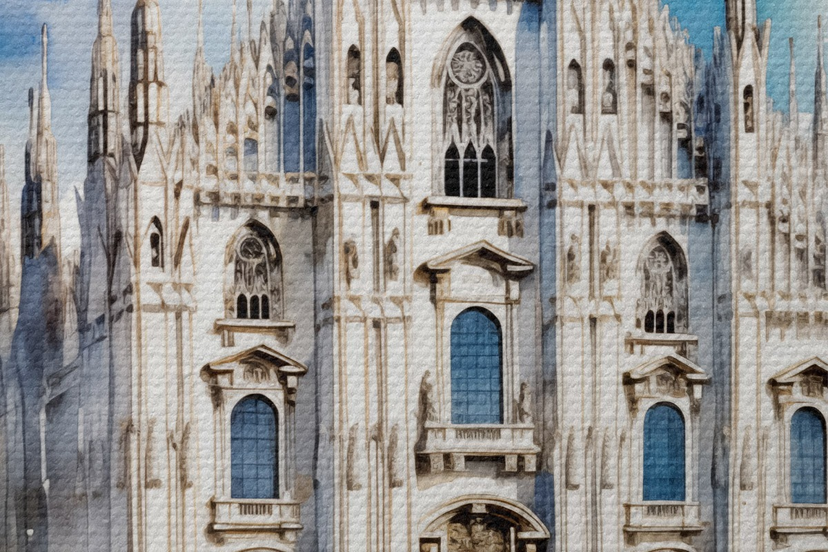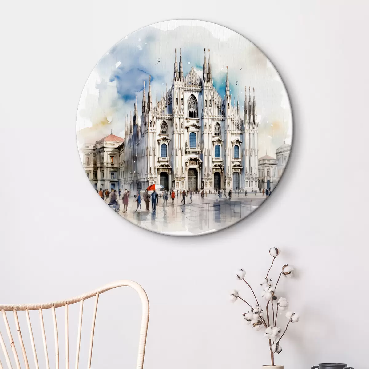 Кругла картина Собор Дуомо в Мілані, архітектура, місто, дощ, акварель, синій, сірий, люди йдуть Nr r38938