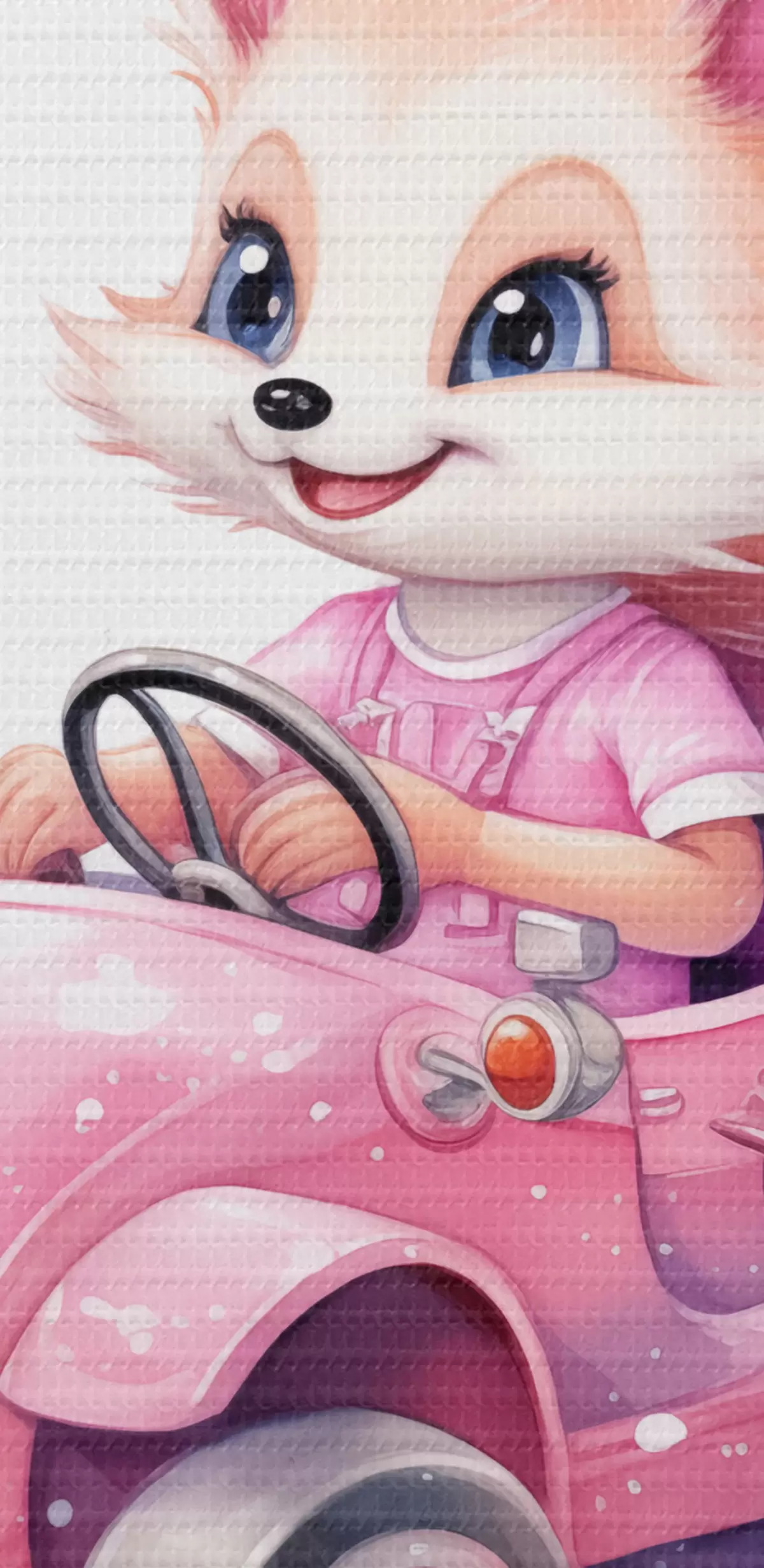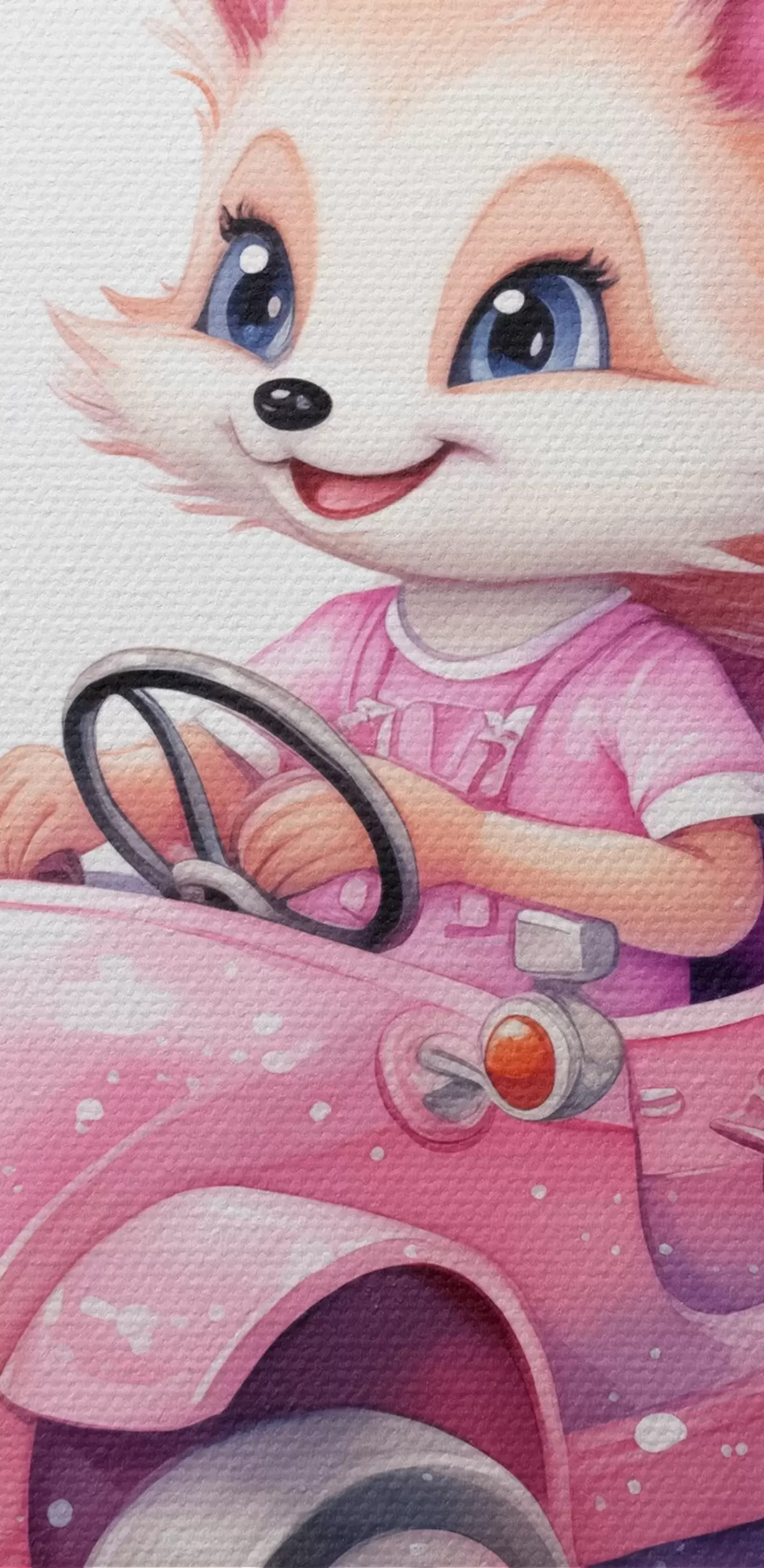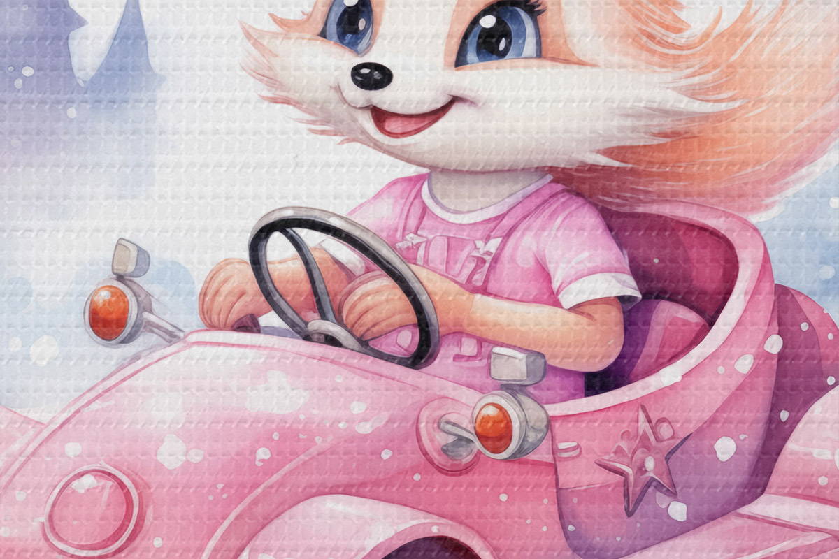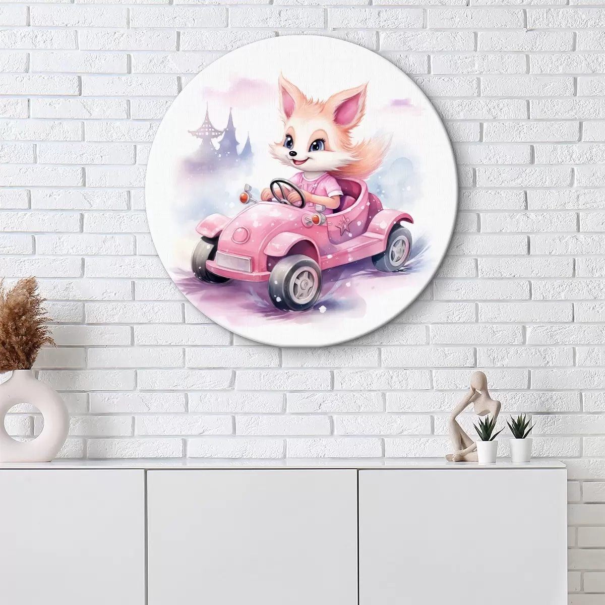 Кругла картина Маленька лисиця їде на рожевій машині для дітей аквареллю Nr r38943