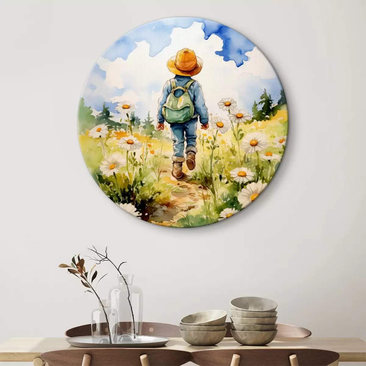 Кругла картина Хлопчик у ковбойському капелюсі з зеленим рюкзаком за спиною та синім костюмі йде стежкою в ромашковому полі, акварель Nr r38946