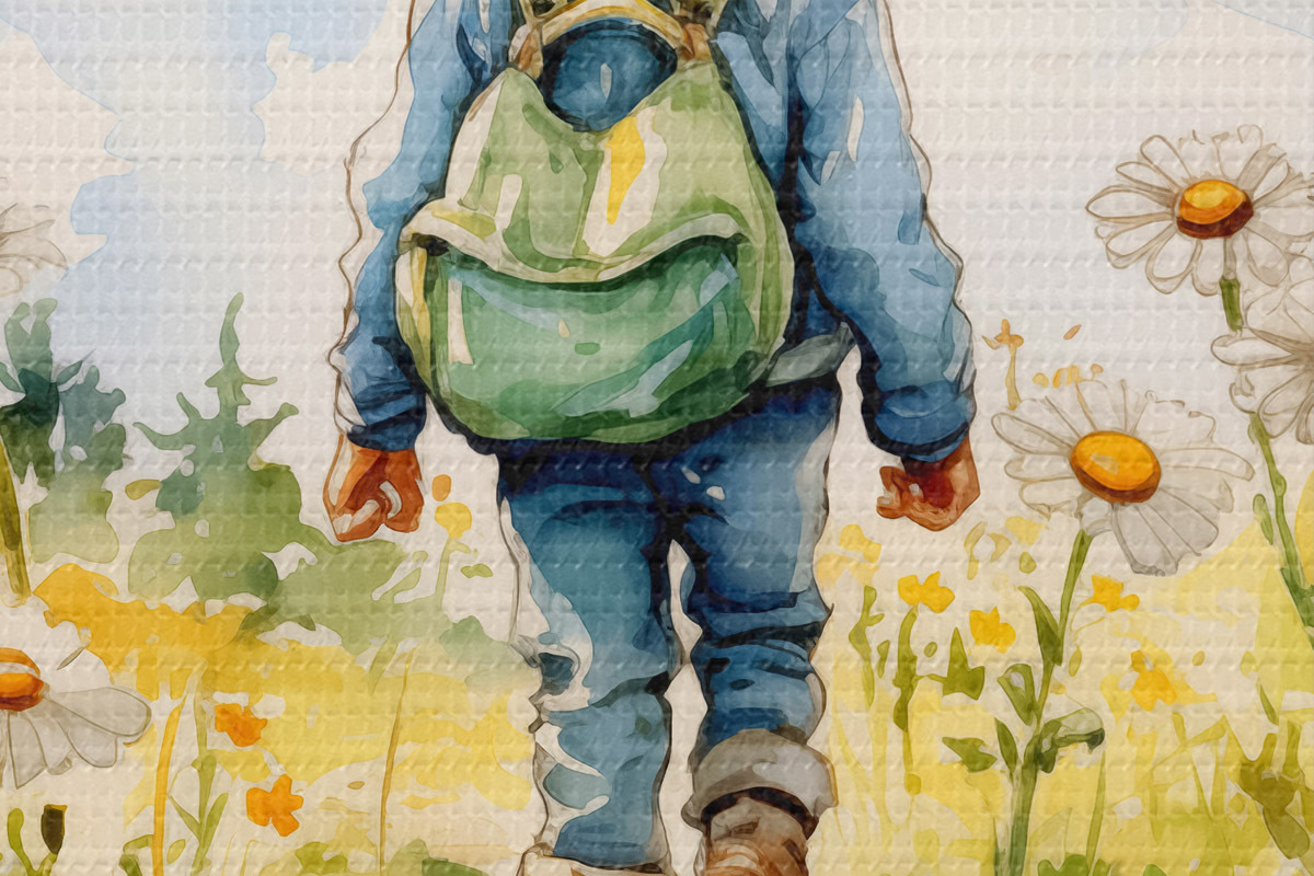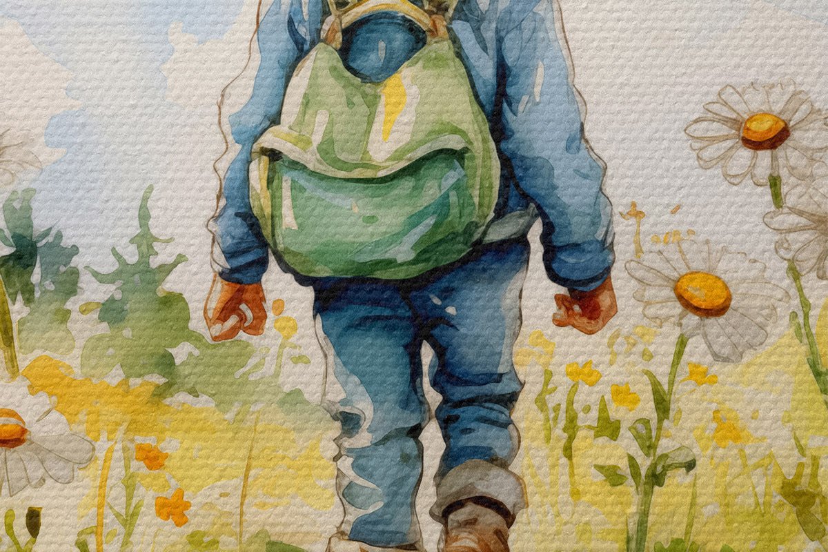 Кругла картина Хлопчик у ковбойському капелюсі з зеленим рюкзаком за спиною та синім костюмі йде стежкою в ромашковому полі, акварель r38946