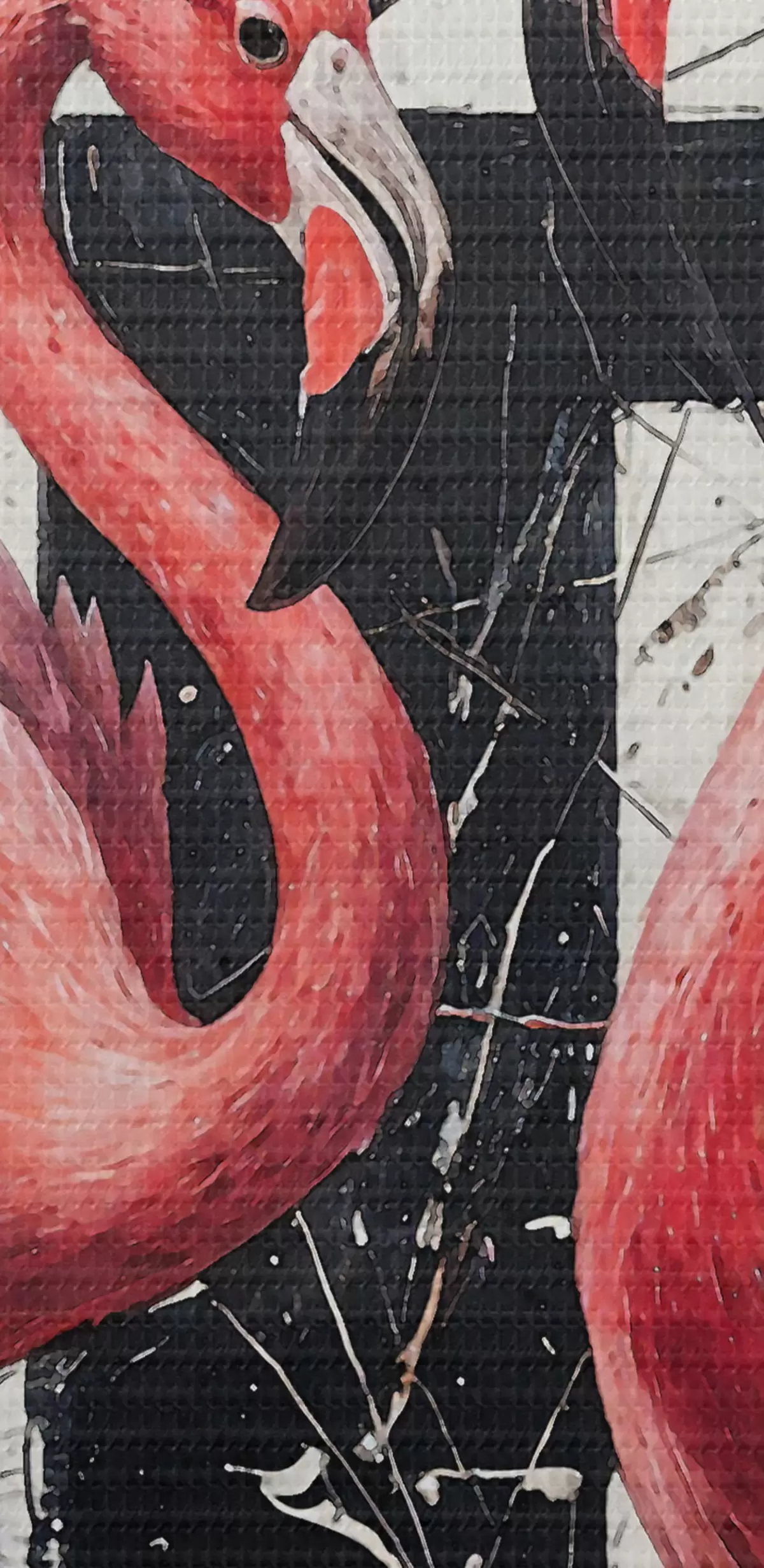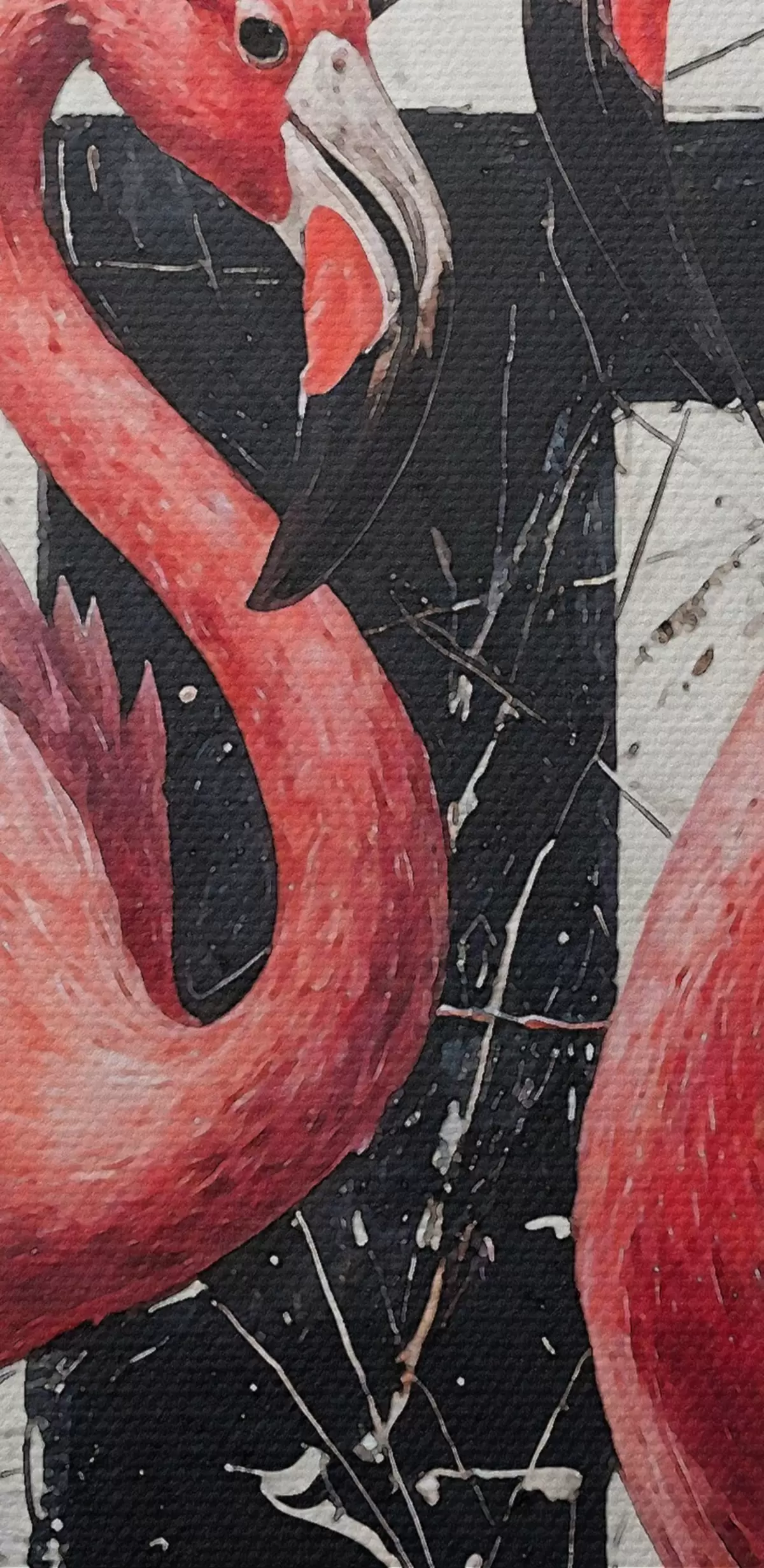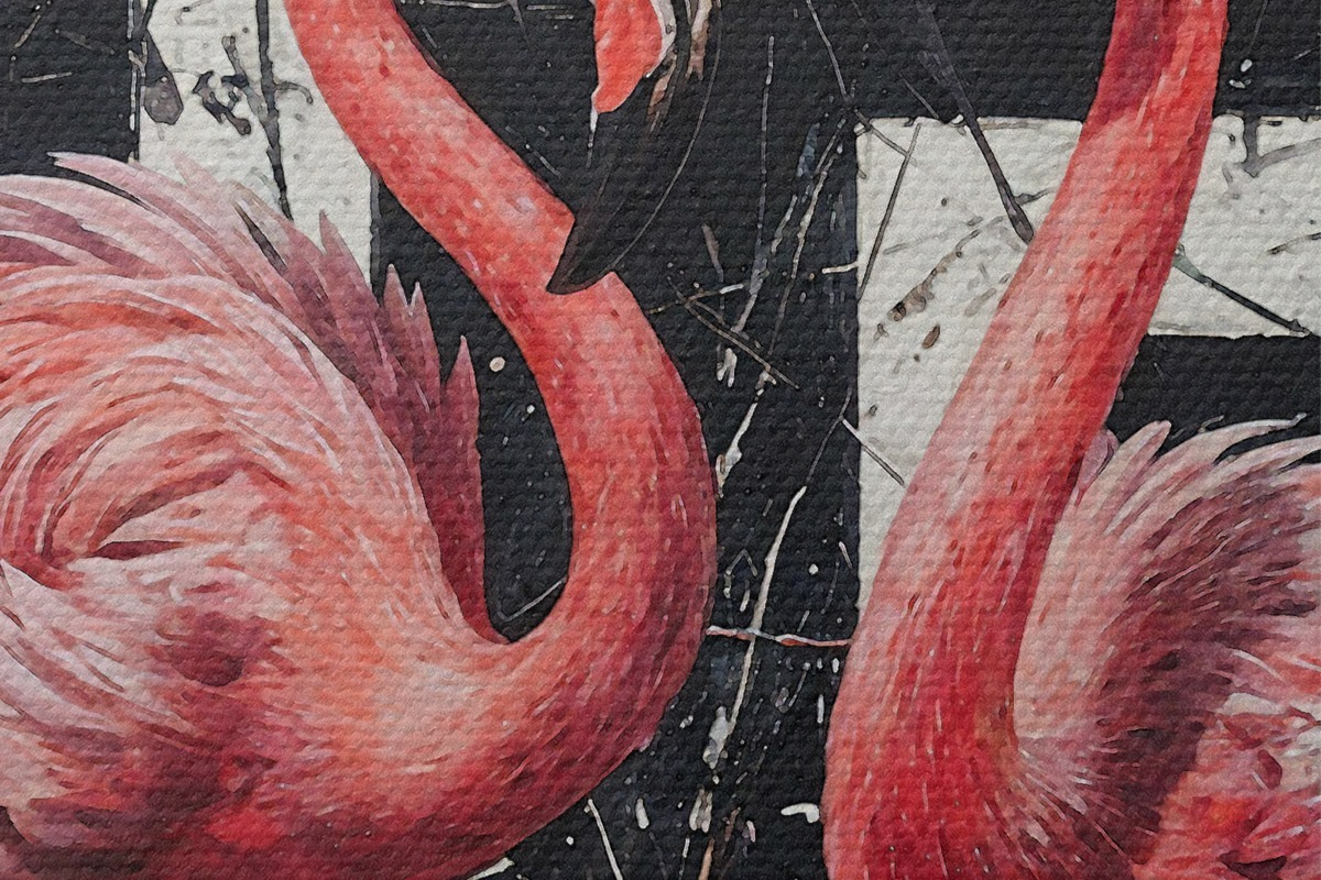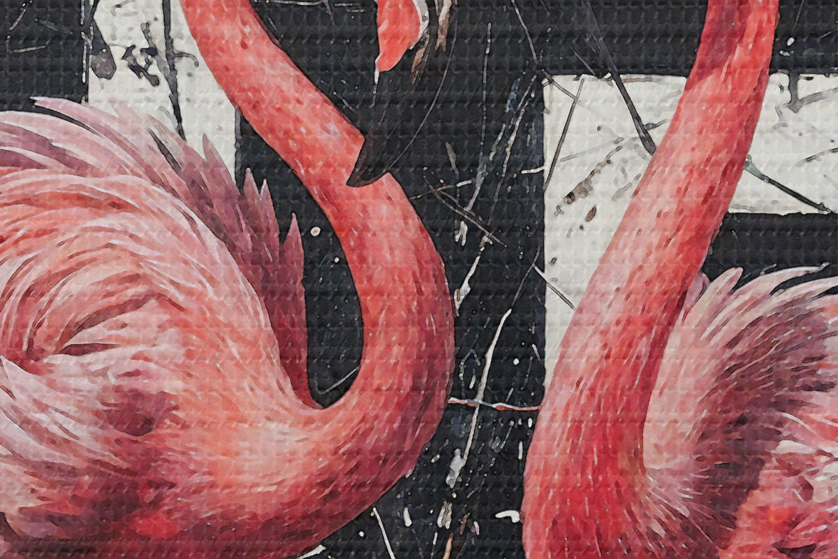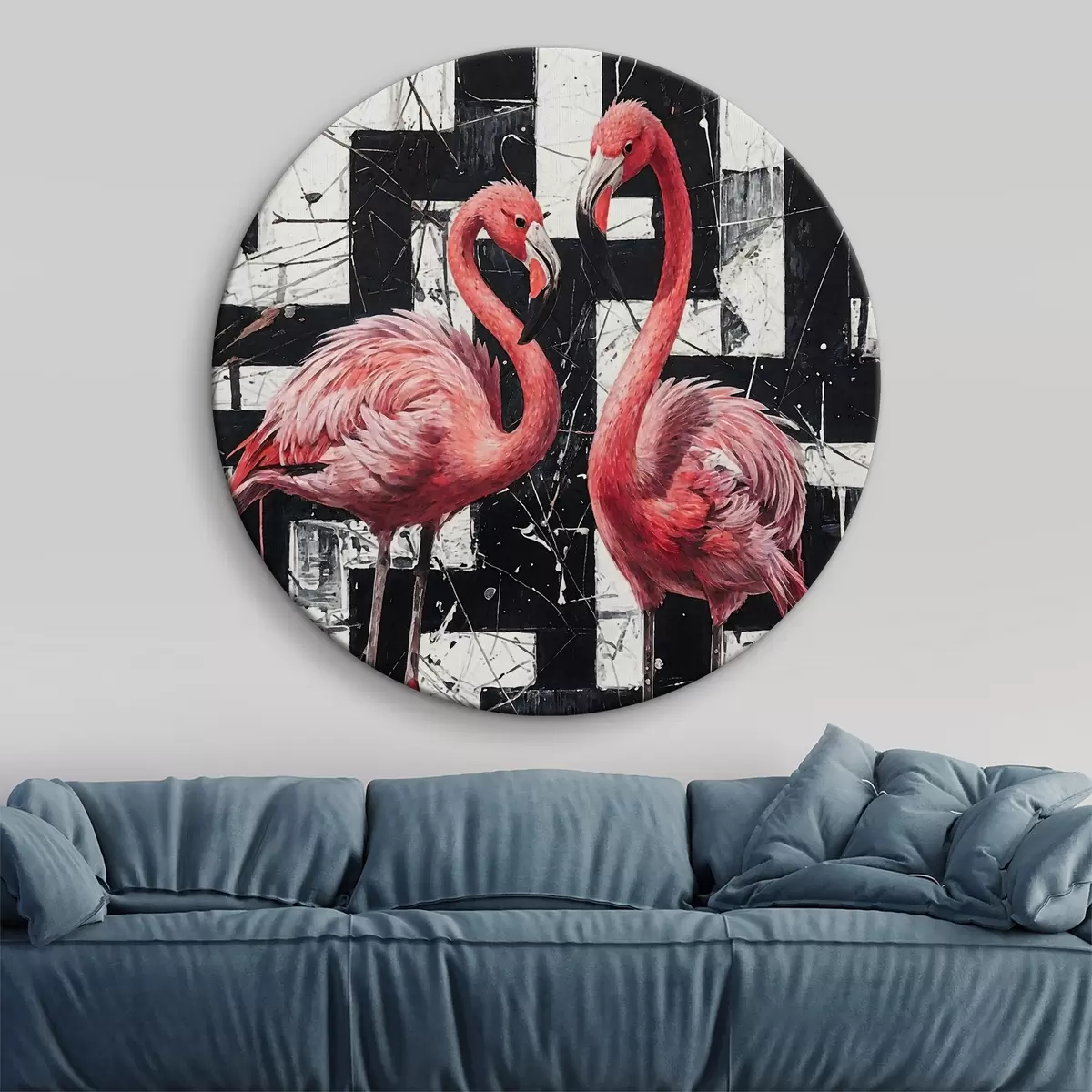 Кругла картина Два рожеві фламінго стоять перед чорно-білим абстрактним фоном художнього живопису Nr r38954