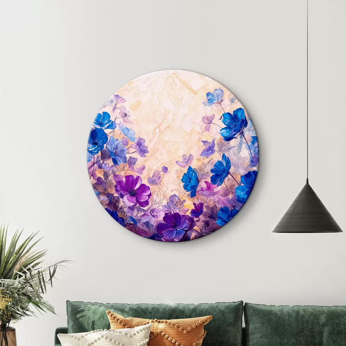 Кругла картина Яскравий малюнок синіх і фіолетових квітів із м’яким розмитим фоном r38964