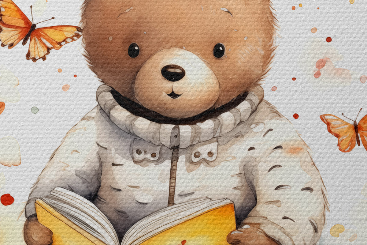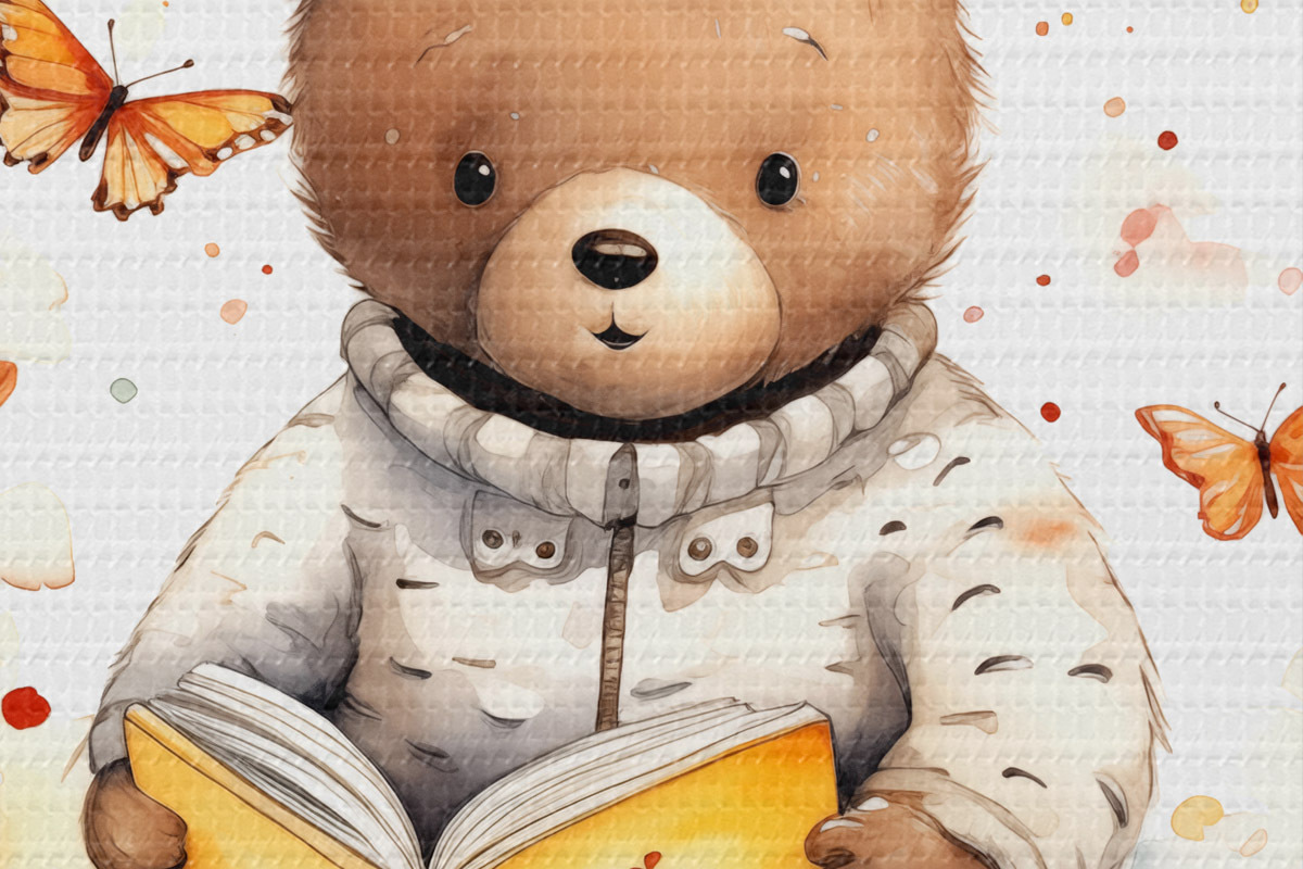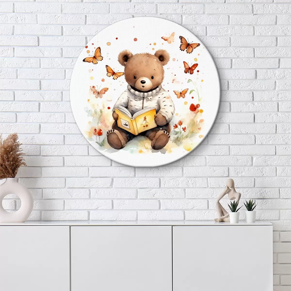 Кругла картина Дитинча бурого ведмедя у светрі читає книгу в оточенні акварельних метеликів Nr r39025