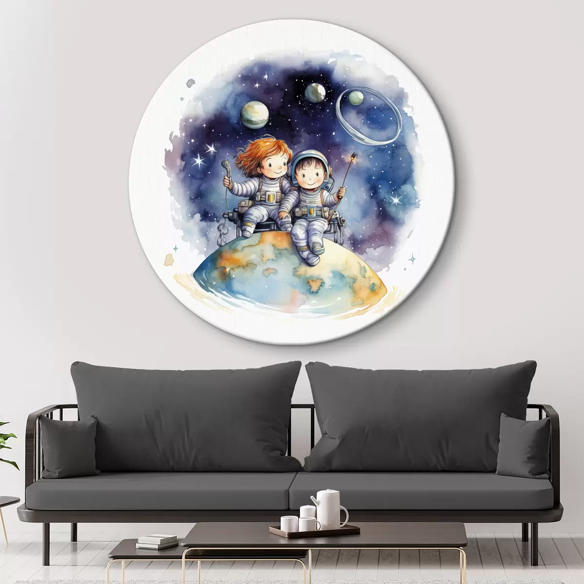 Кругла картина Діти в скафандрах, сидячи на планеті в космічному дитячому аквареллю ілюстрації r39117