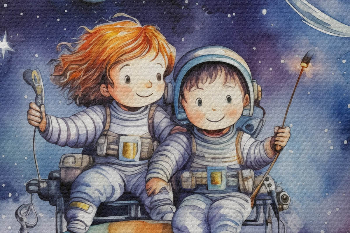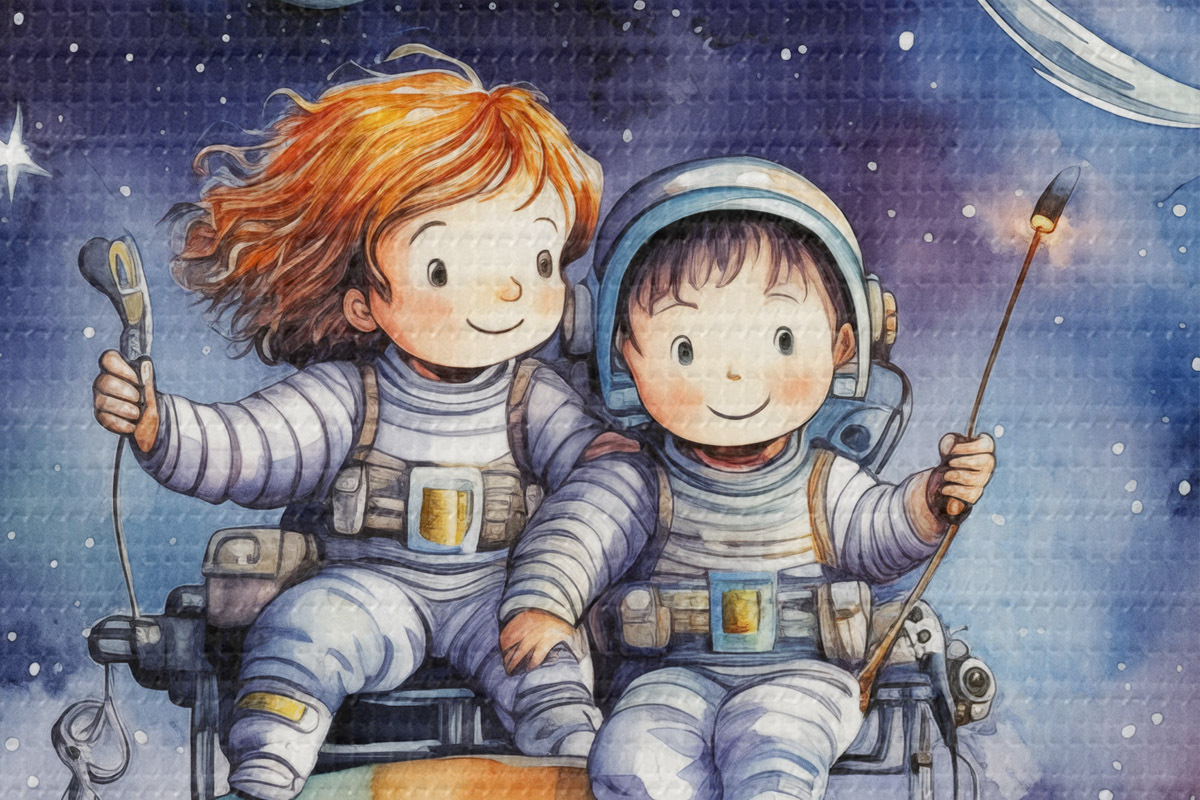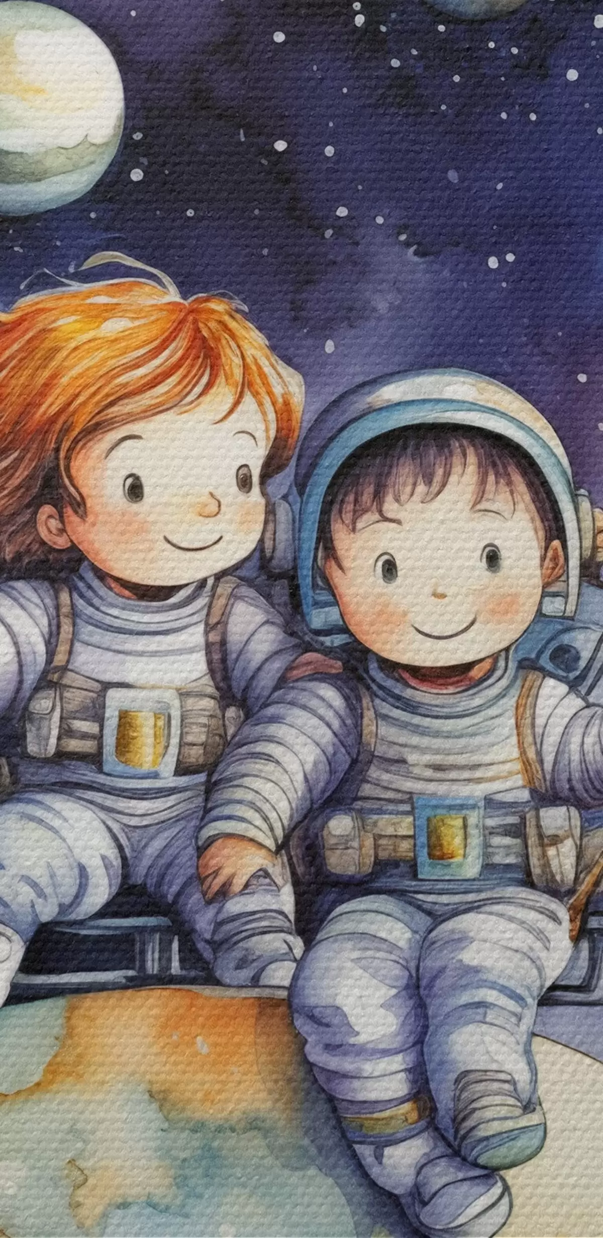 Кругла картина Діти в скафандрах, сидячи на планеті в космічному дитячому аквареллю ілюстрації Nr r39117