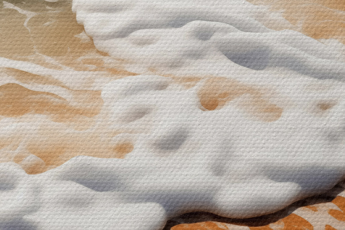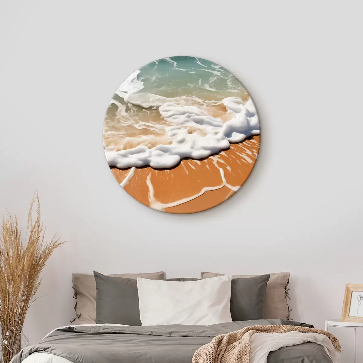 Кругла картина Піна морської хвилі з'єднується з піщаним берегом, блакитним, білим і оранжевим, бежевим кольором Nr r39122