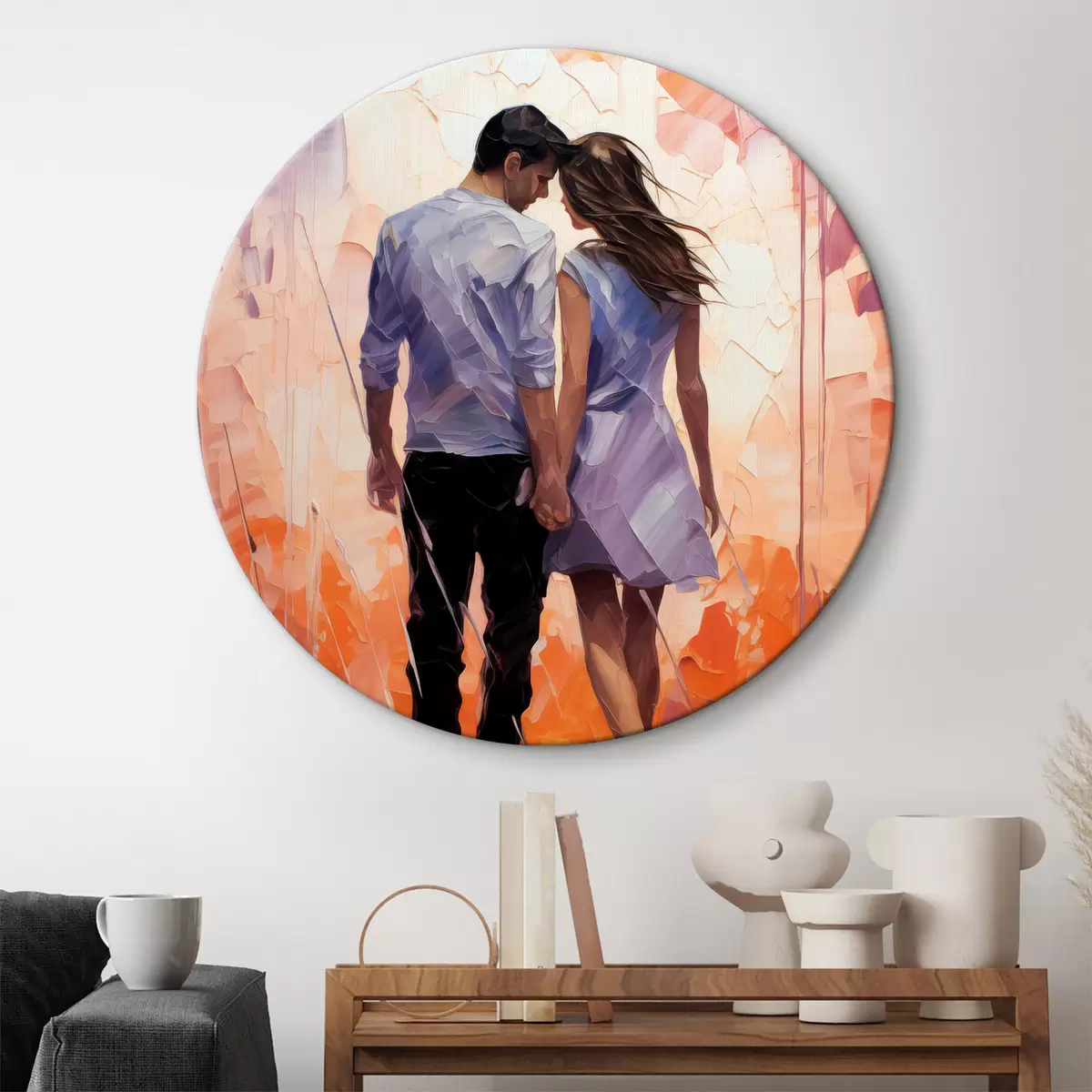 Кругла картина Силует закохана пара абстрактного живопису, дівчина і хлопець, рожевий, оранжевий, фіолетовий, чорний колір Nr r39124