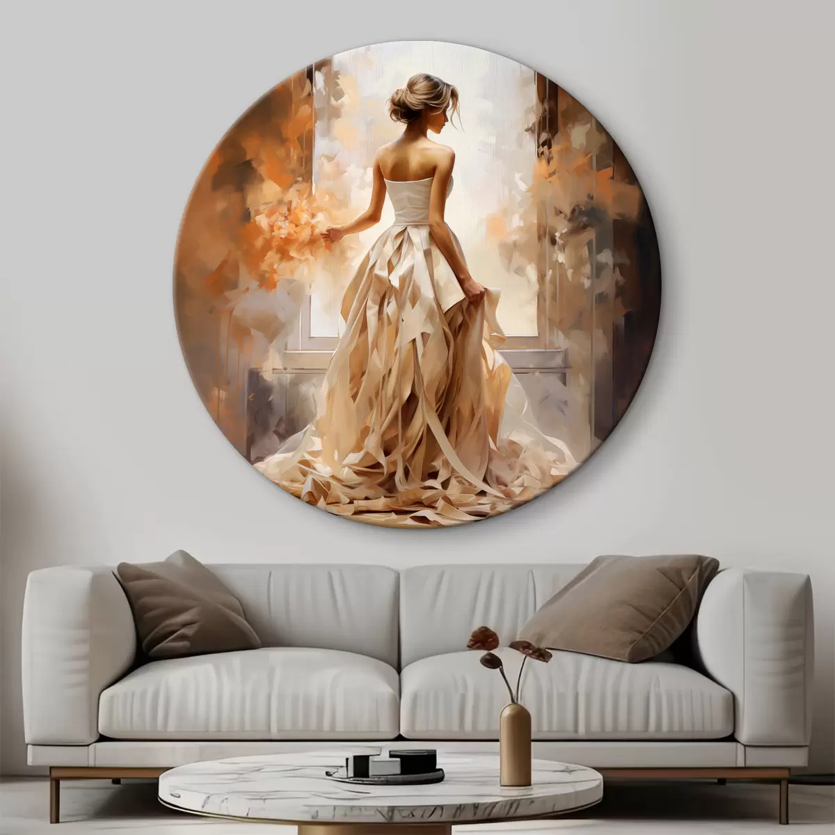 Кругла картина Дівчина в білій весільній довгій сукні стоїть біля вікна серед вогню, малюючи ручною роботою Nr r39125