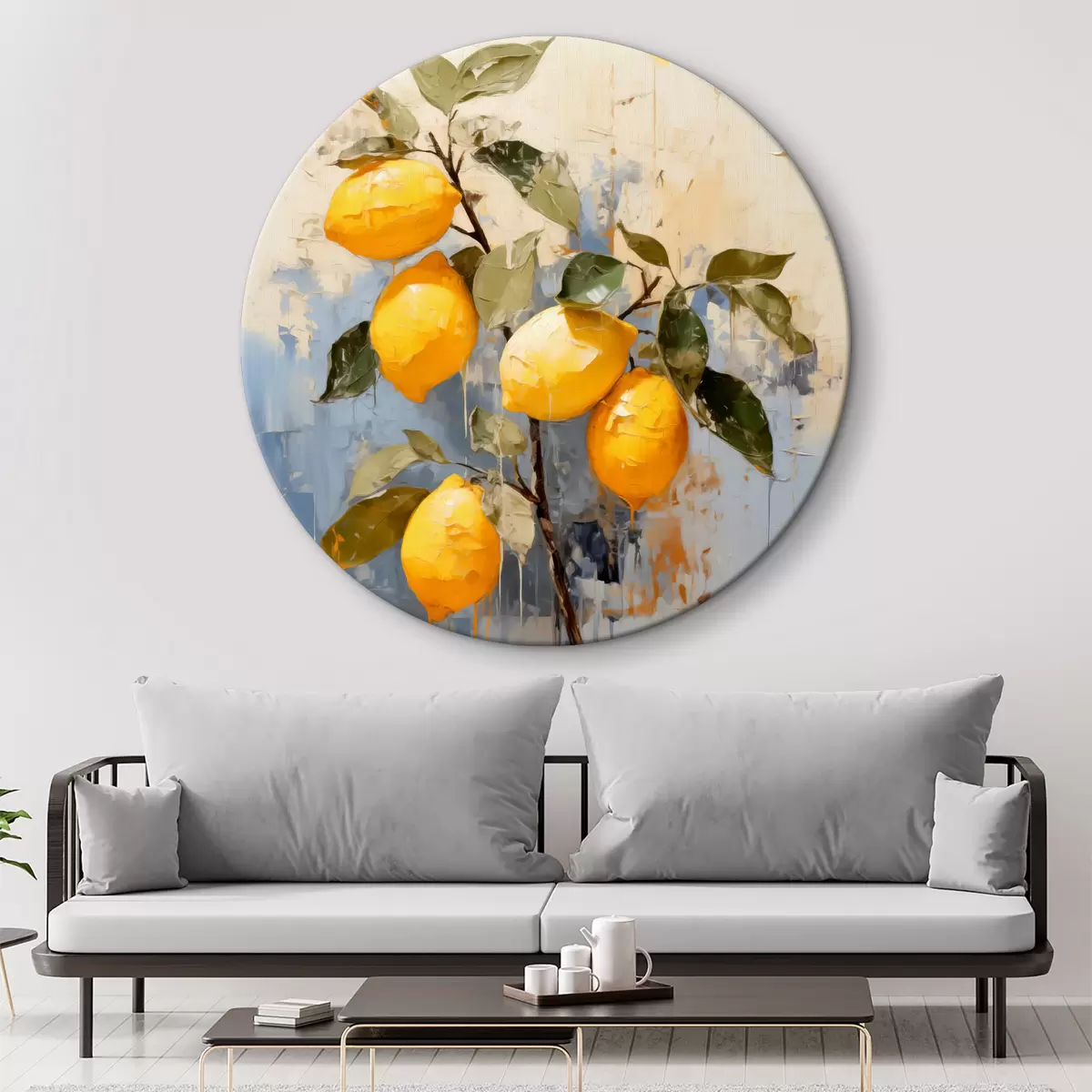 Кругла картина Гілка з стиглими лимонами олійного живопису абстрактного мистецтва, жовтого, синього та зеленого кольорів Nr r39186
