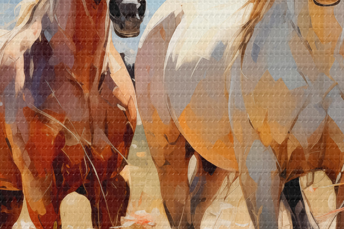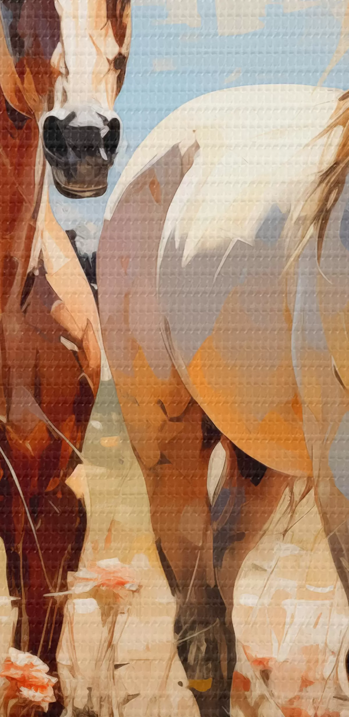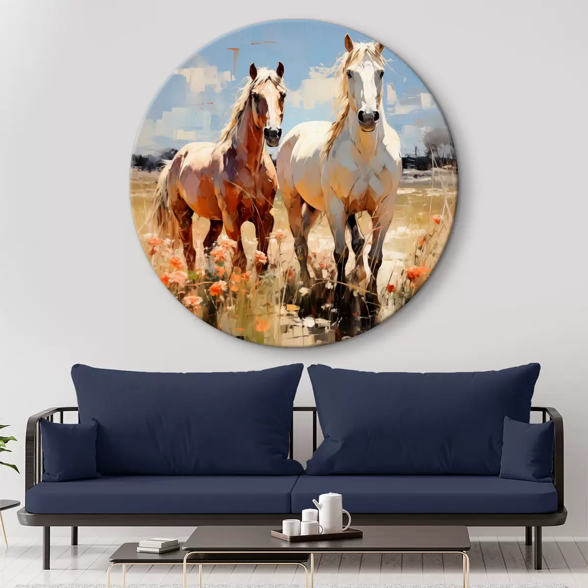 Кругла картина Білі та коричневі коні пасуться на лузі серед польових квітів, олійний живопис, абстрактне мистецтво Nr r39187