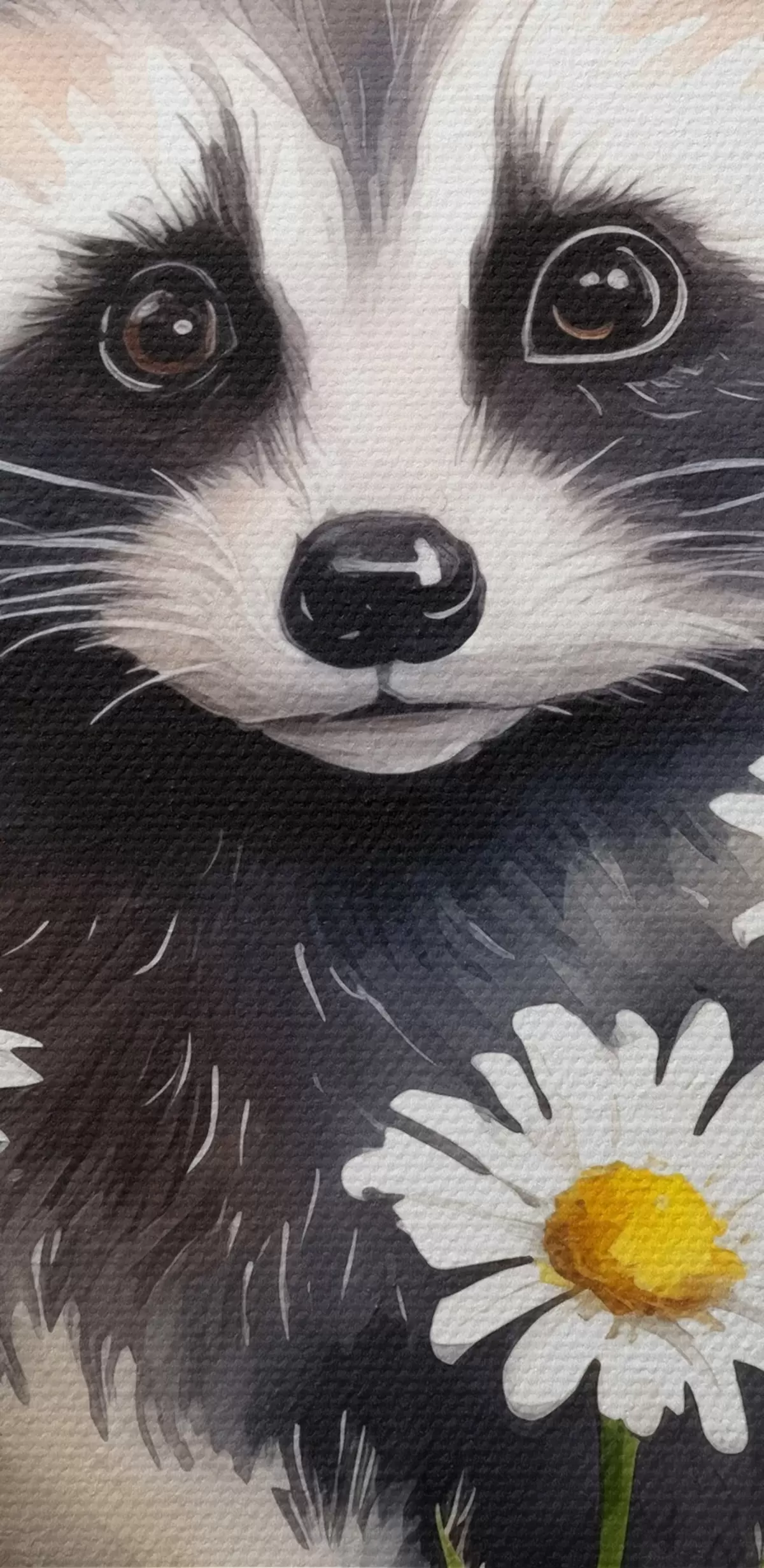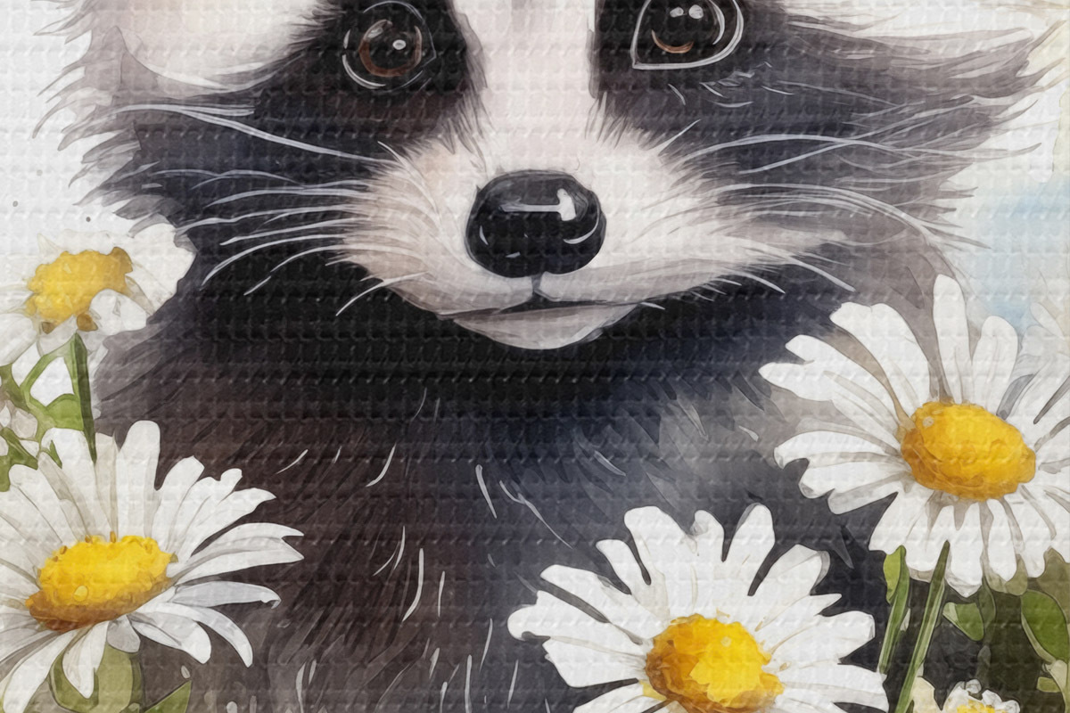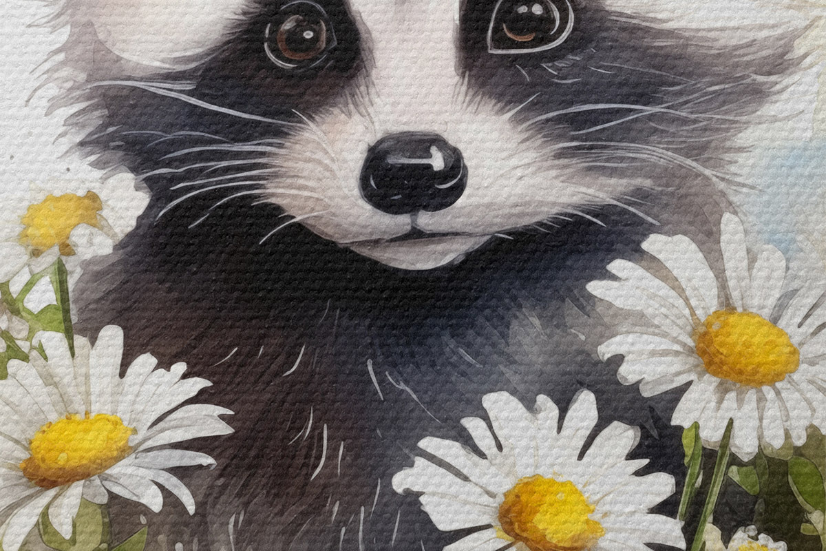 Кругла картина Маленький єнот сидить у ромашках аквареллю дитячої ілюстрації Nr r39336