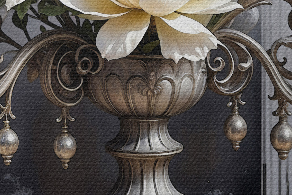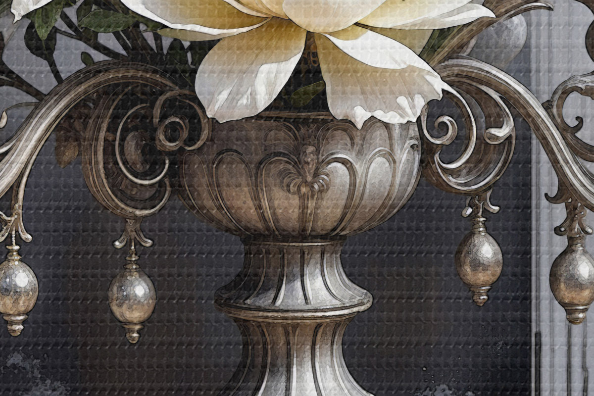 Кругла картина Букет великих білих квітів жоржин у вишуканій срібній вазі в оточенні запалених свічок на дерев'яному столі Nr r39384
