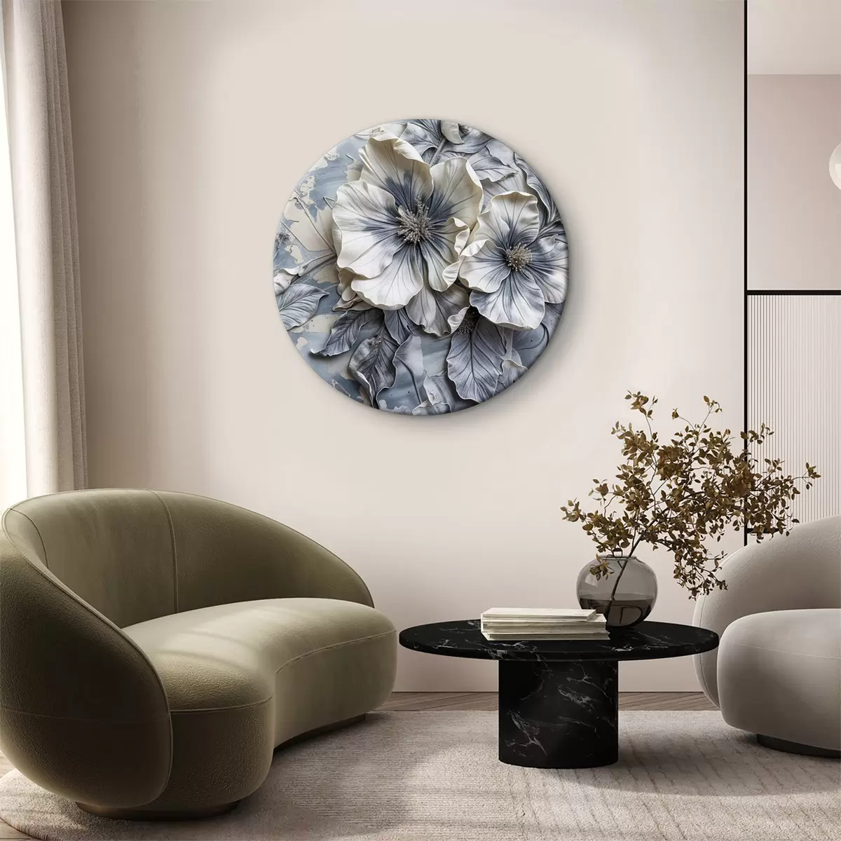 Кругла картина Велика сіро-біла картина маслом квітів із складними деталями на м’якому розмитому фоні Nr r39385
