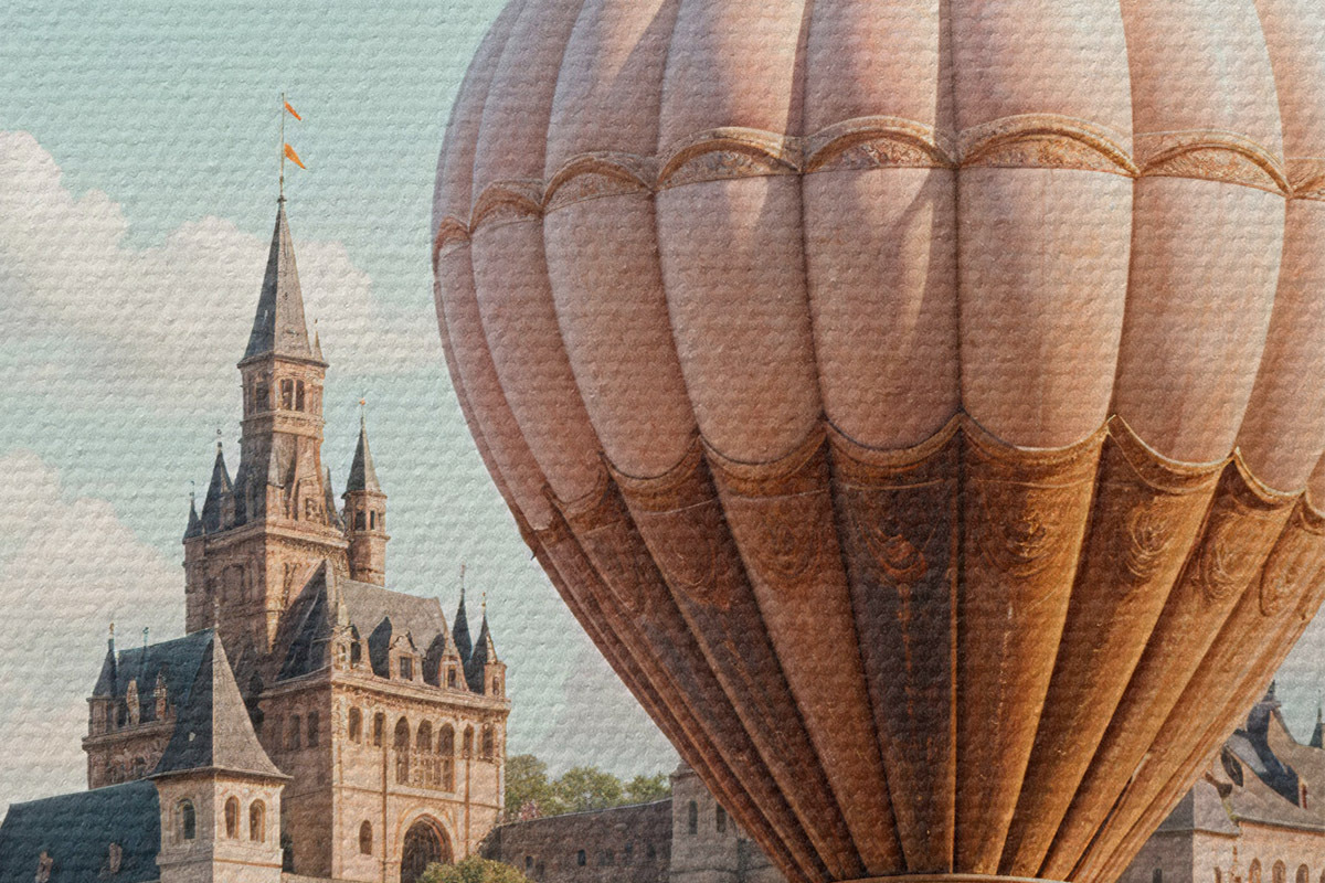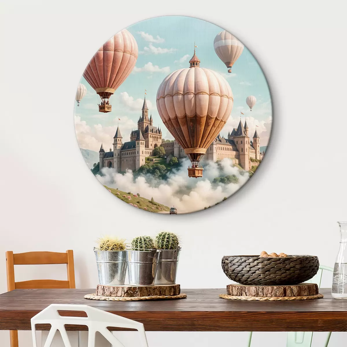 Кругла картина Фантазійний замок, оточений рожевими повітряними кульками, що ширяє в хмарному небі над пишним зеленим ландшафтом Nr r39387