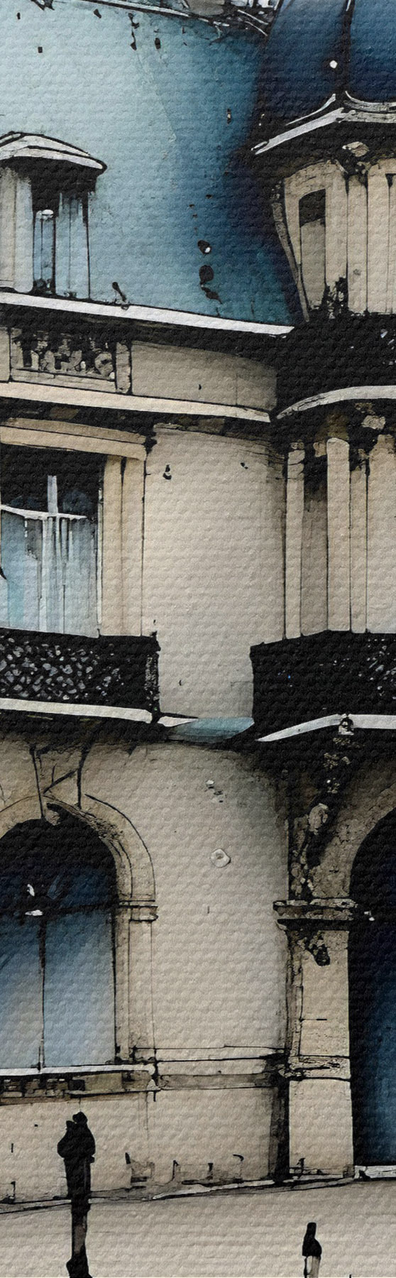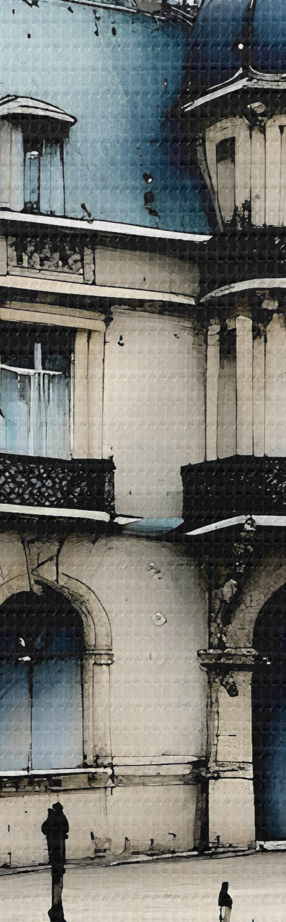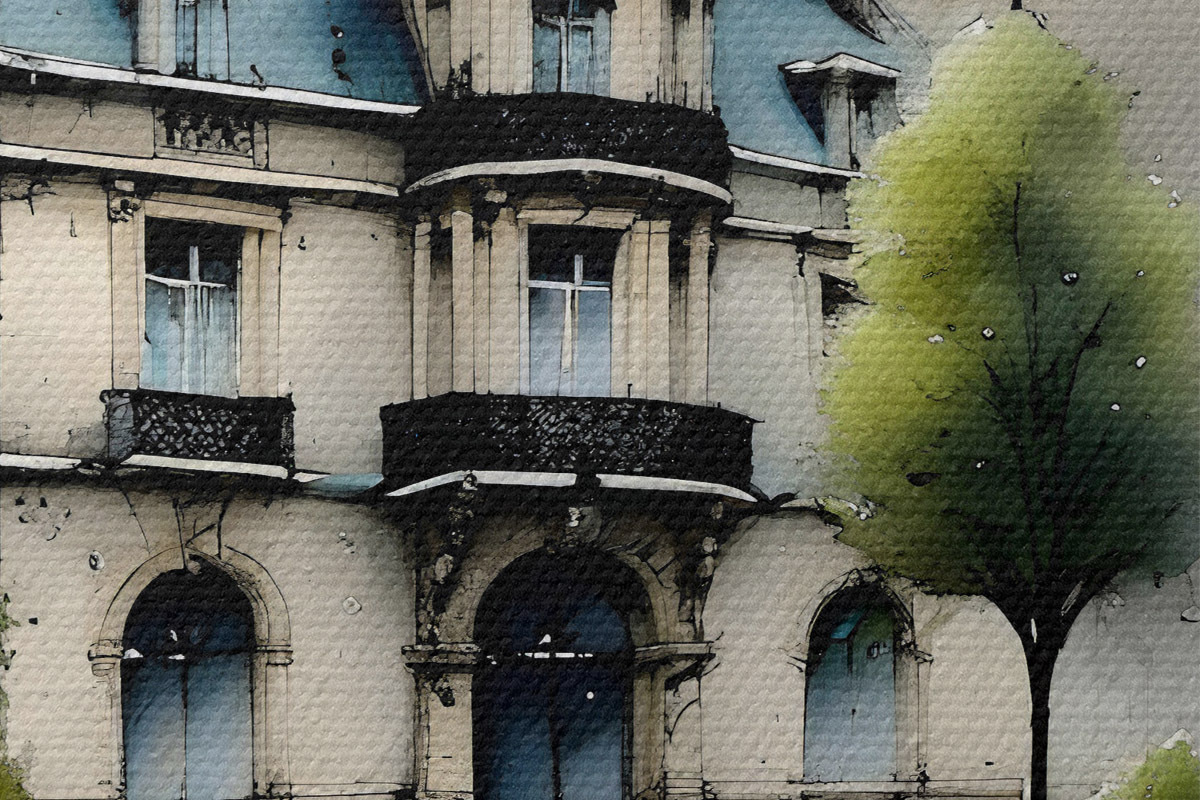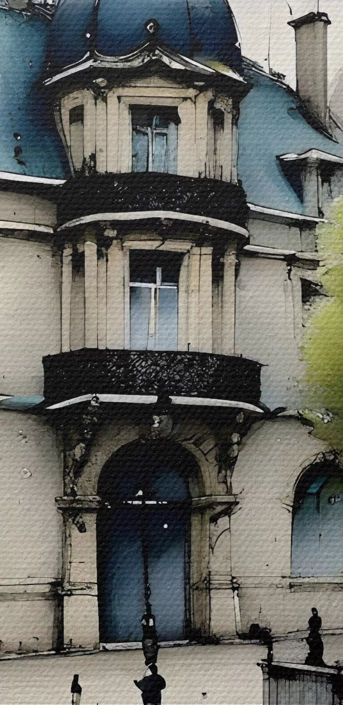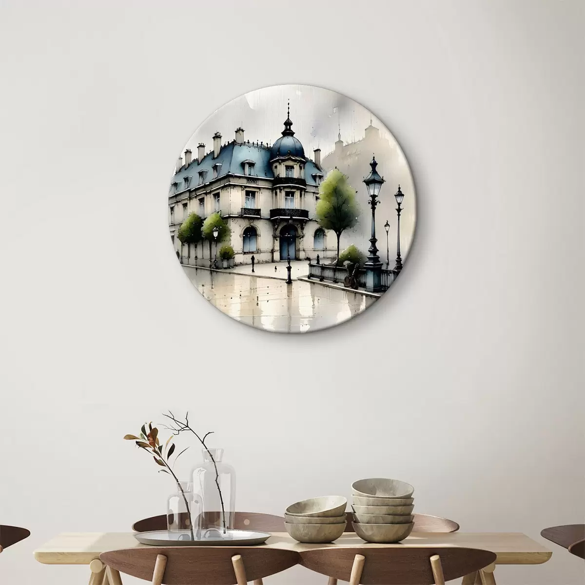 Кругла картина Велична будівля аквареллю в оточенні ліхтарних стовпів і дерев у дощовий день Nr r39391
