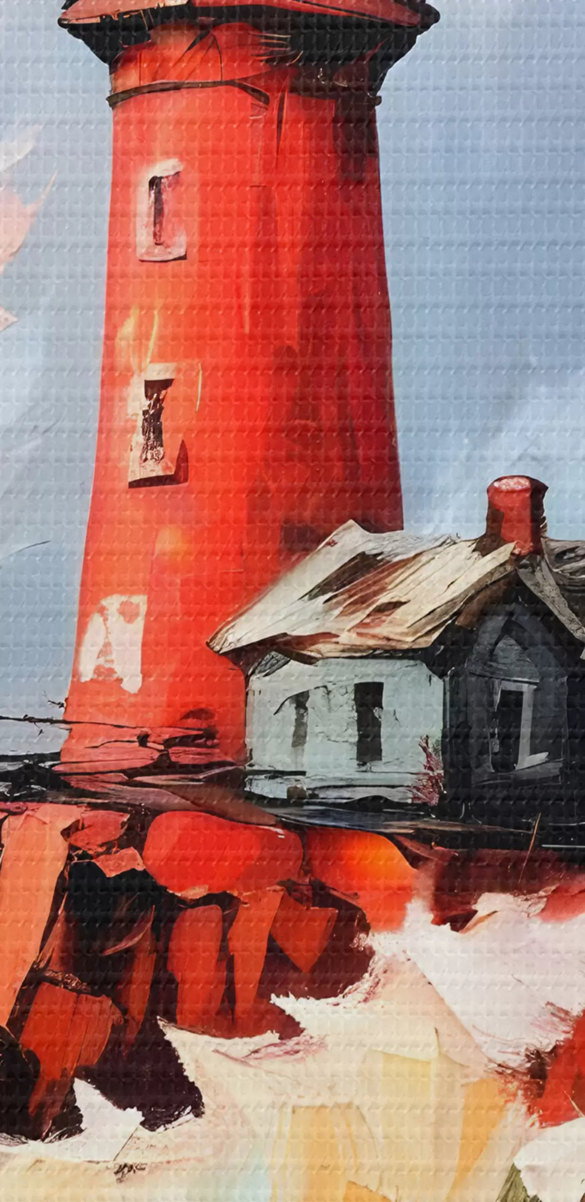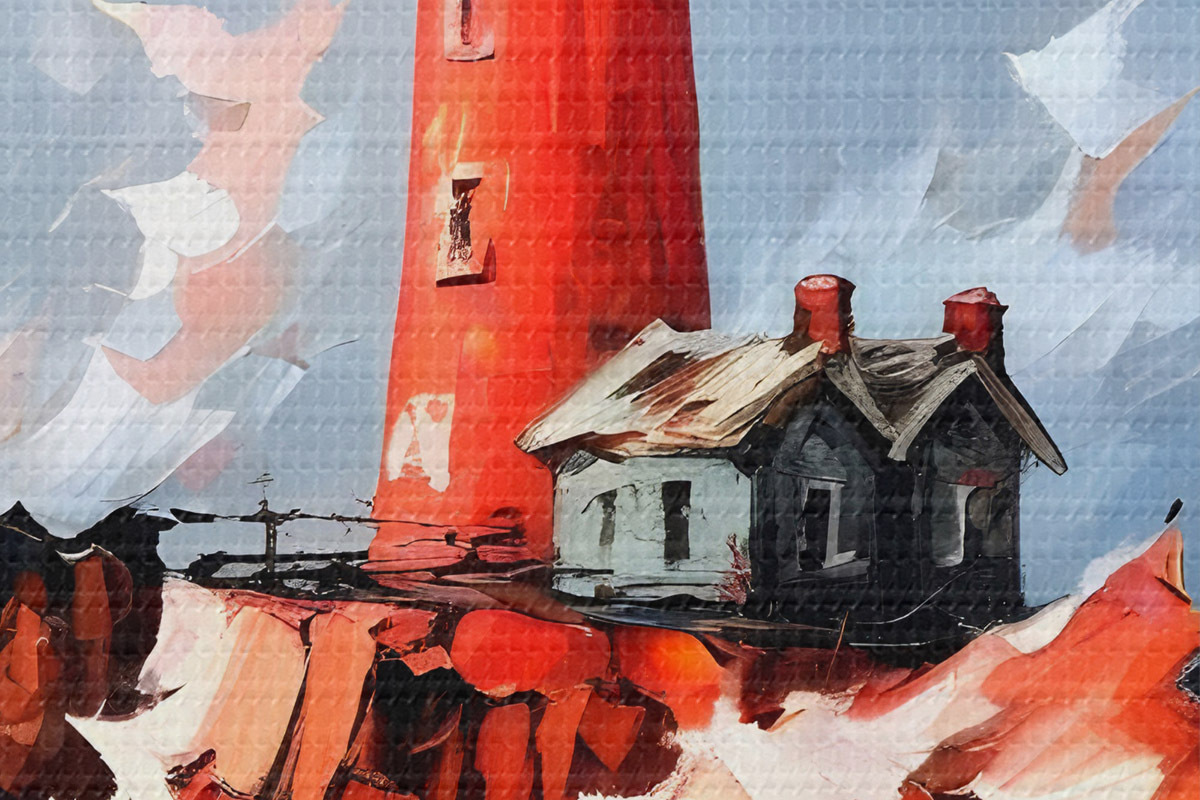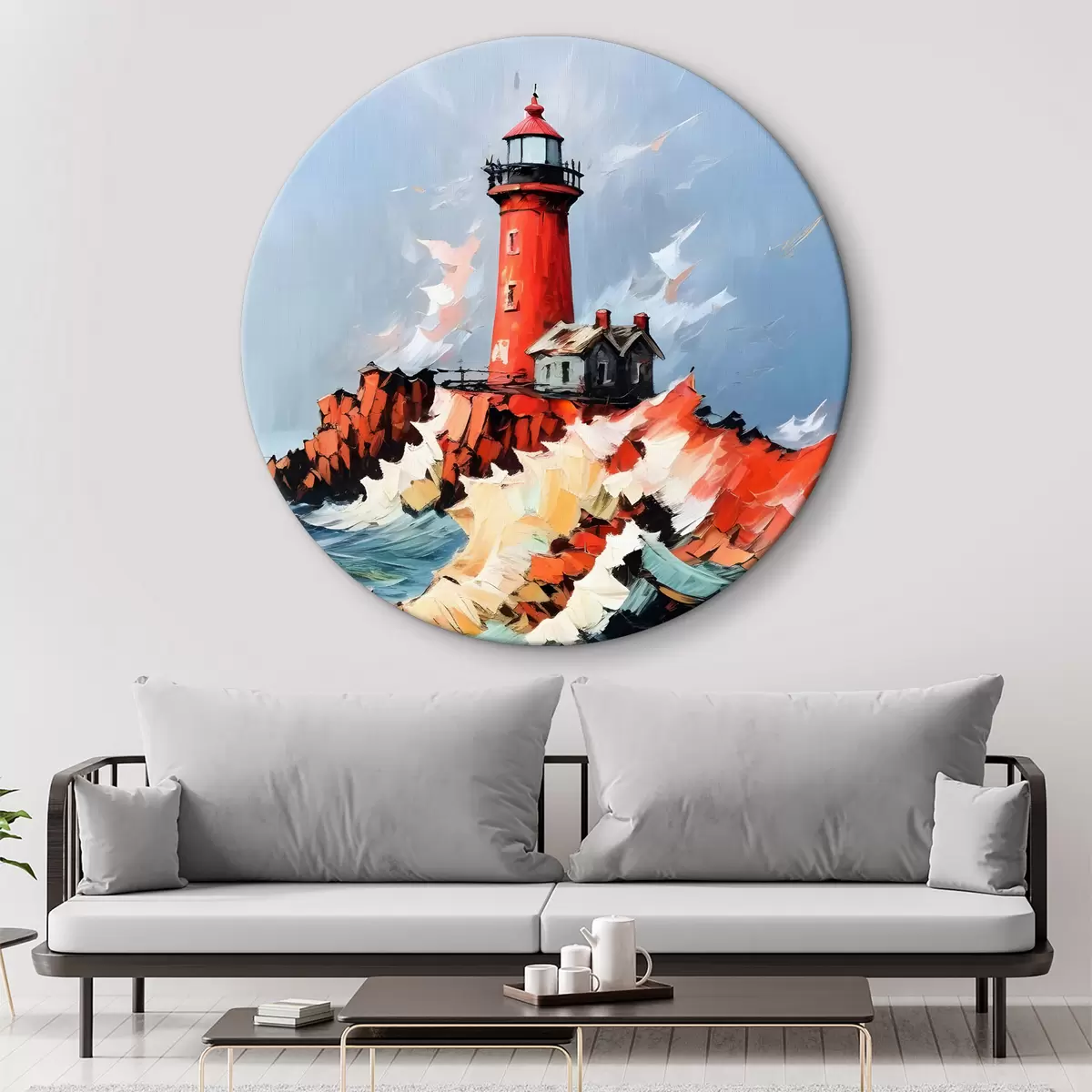 Кругла картина Картина із зображенням червоного маяка, що стоїть високо на скелястій скелі, оточений розбійними хвилями та грозовим небом Nr r39392
