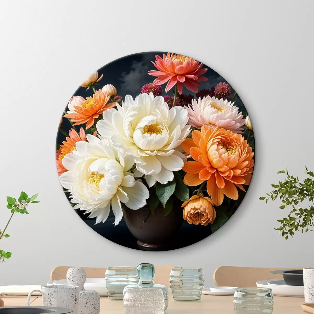 Кругла картина Букет яскравих квітів жоржин різних кольорів на темному тлі Nr r39399
