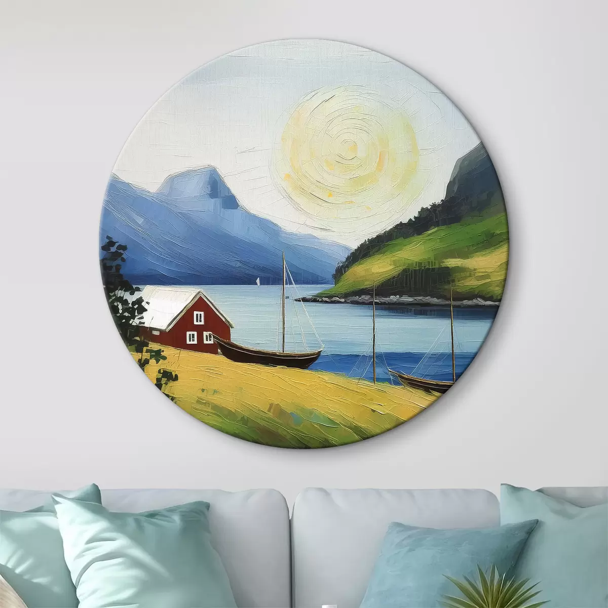 Кругла картина Північне літо, будиночок на березі моря, сонце в блакитному небі, гори Nr r39423