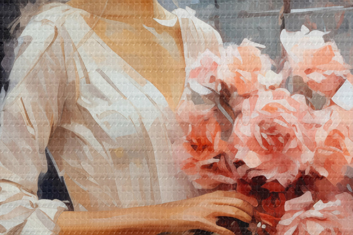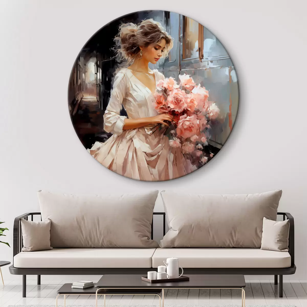 Кругла картина Дівчина в білій сукні на вокзалі тримає в руках букет рожевих троянд, картина маслом Nr r39438