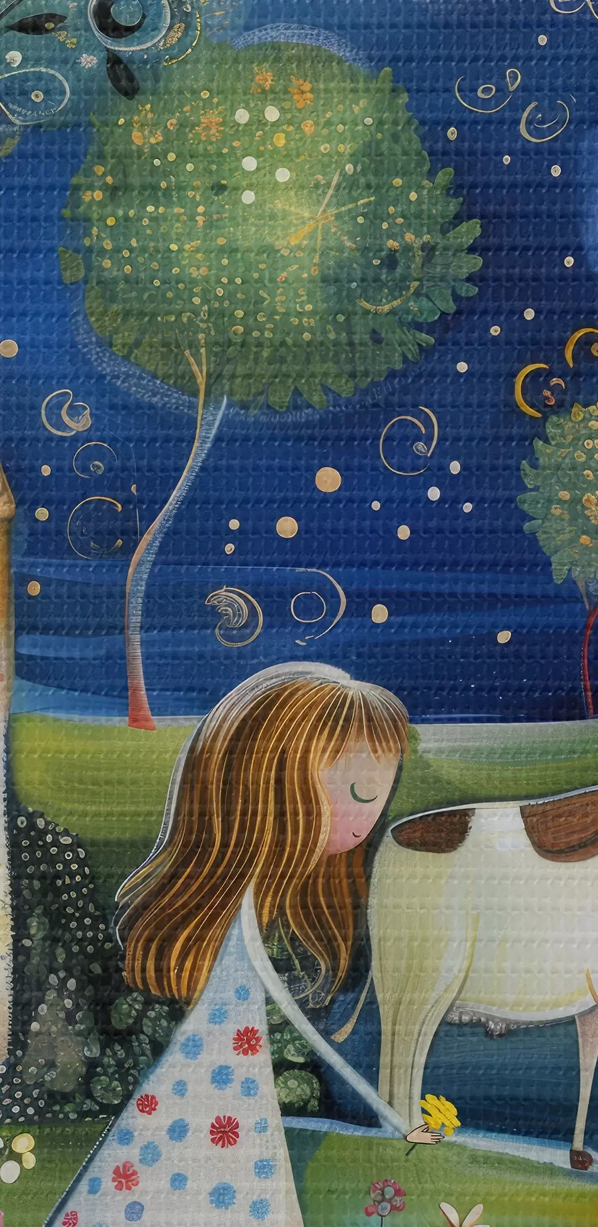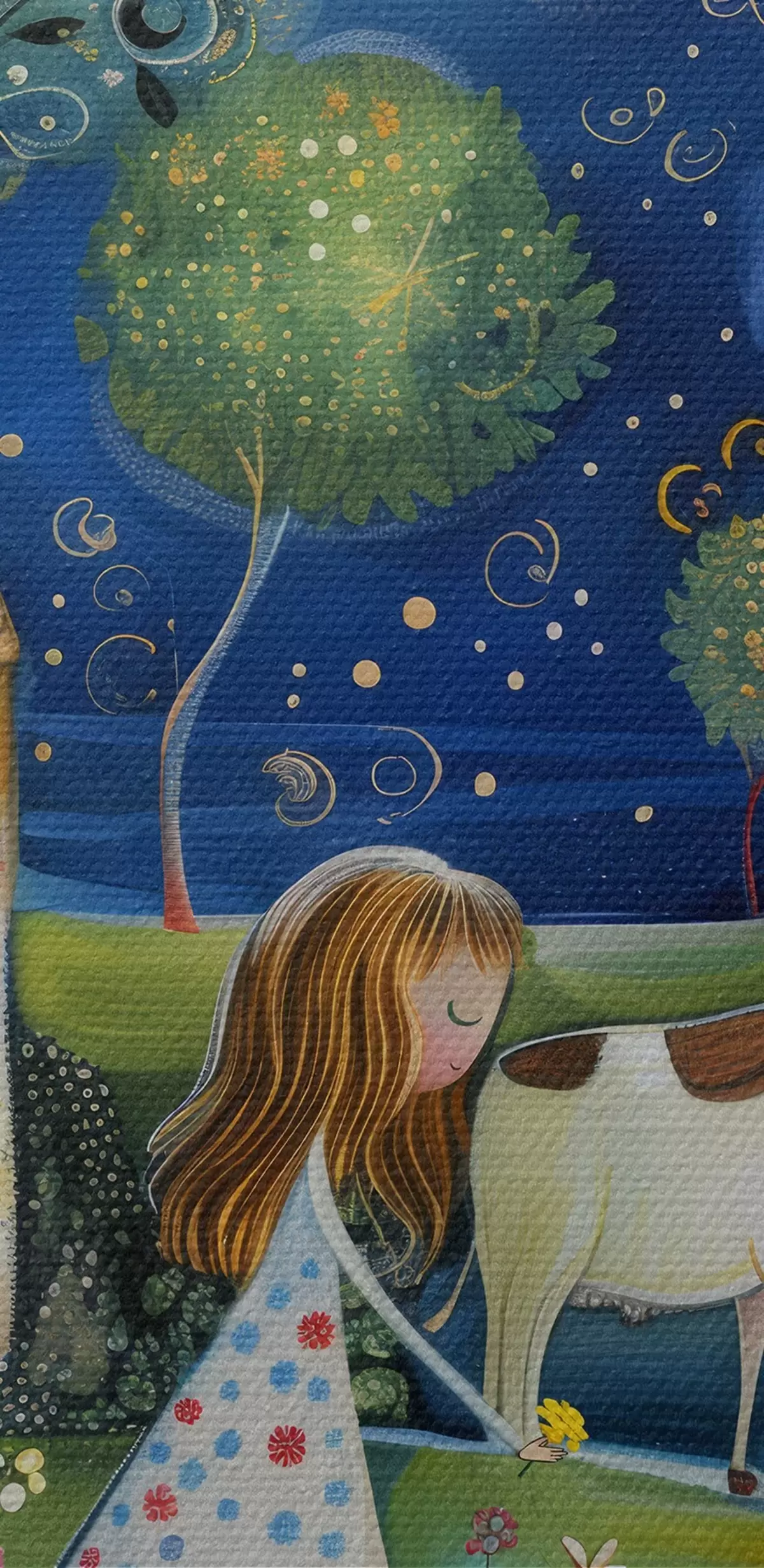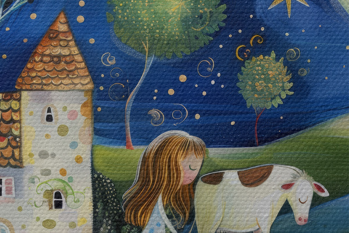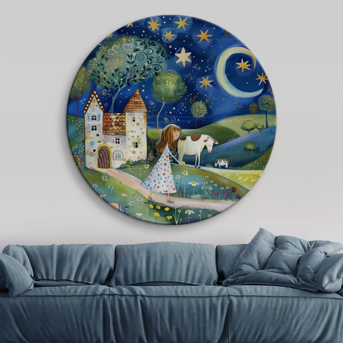 Кругла картина Маленька принцеса, собака, корова та фантастичний будиночок під зорями в химерному стилі наївного мистецтва Nr r39451
