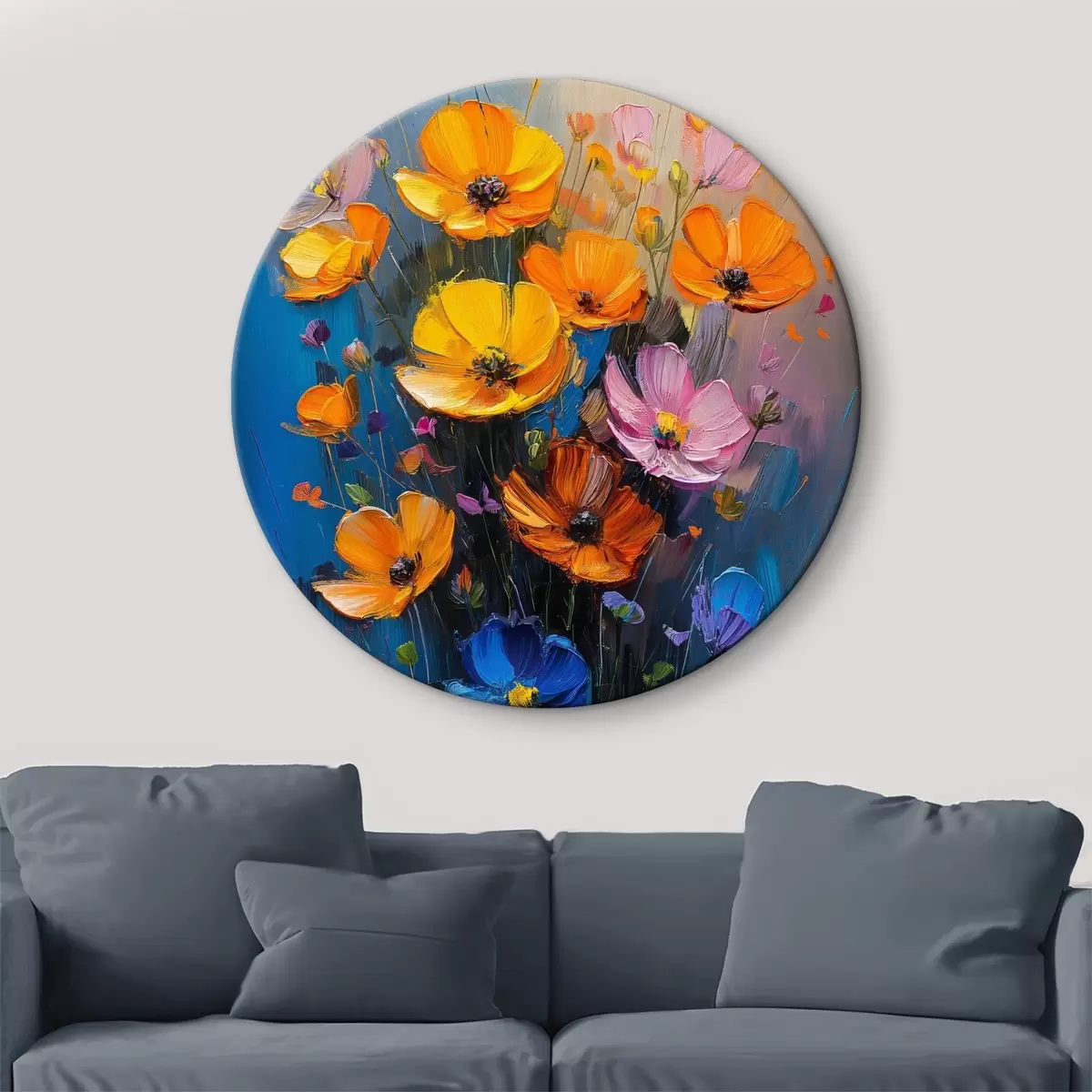 Кругла картина Живописна симфонія: світло-жовті, помаранчеві, рожеві та блакитні мазки маків. Nr r39454