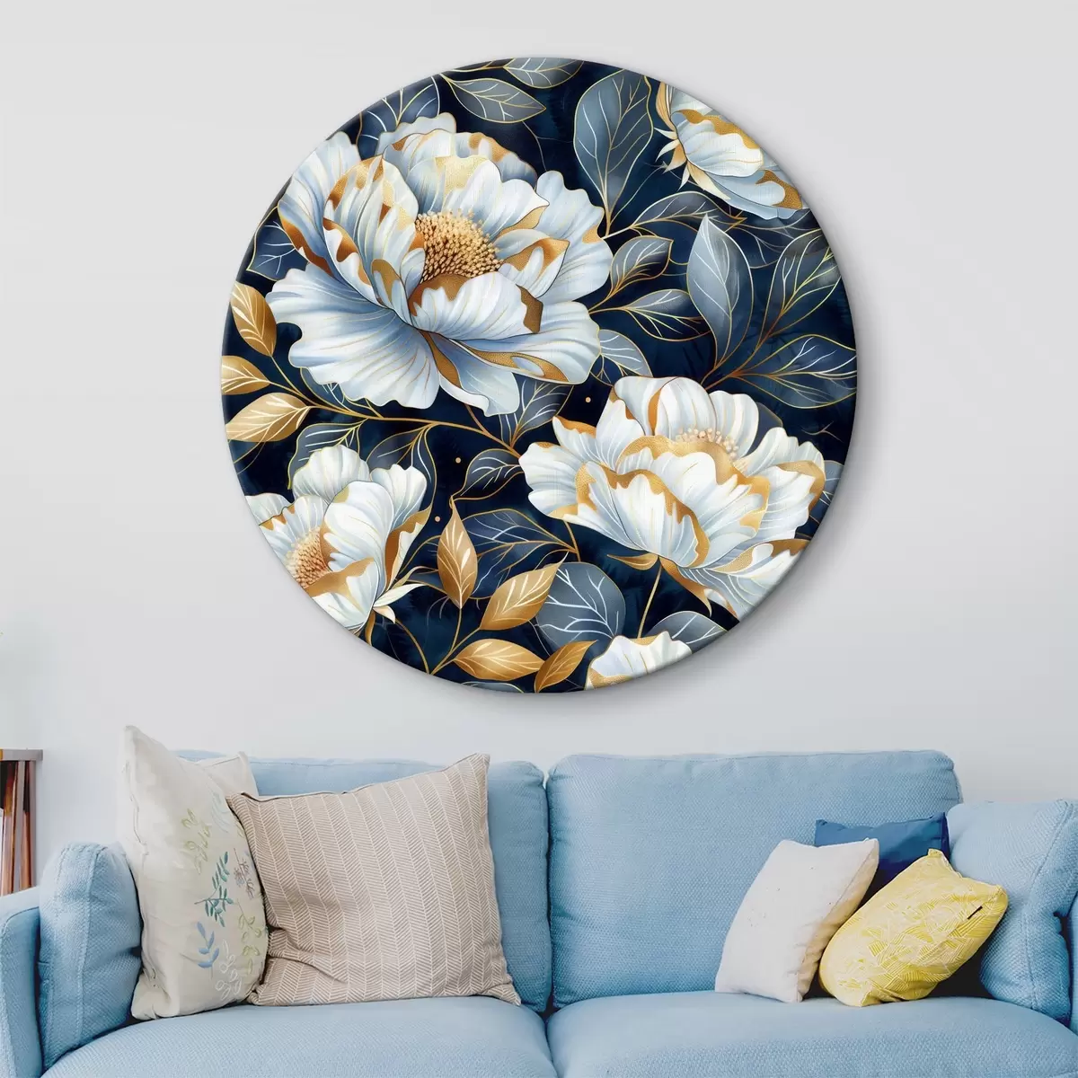 Кругла картина Білі півонії та троянди з контуром, синє листя та квіткові візерунки на задньому плані Nr r39457