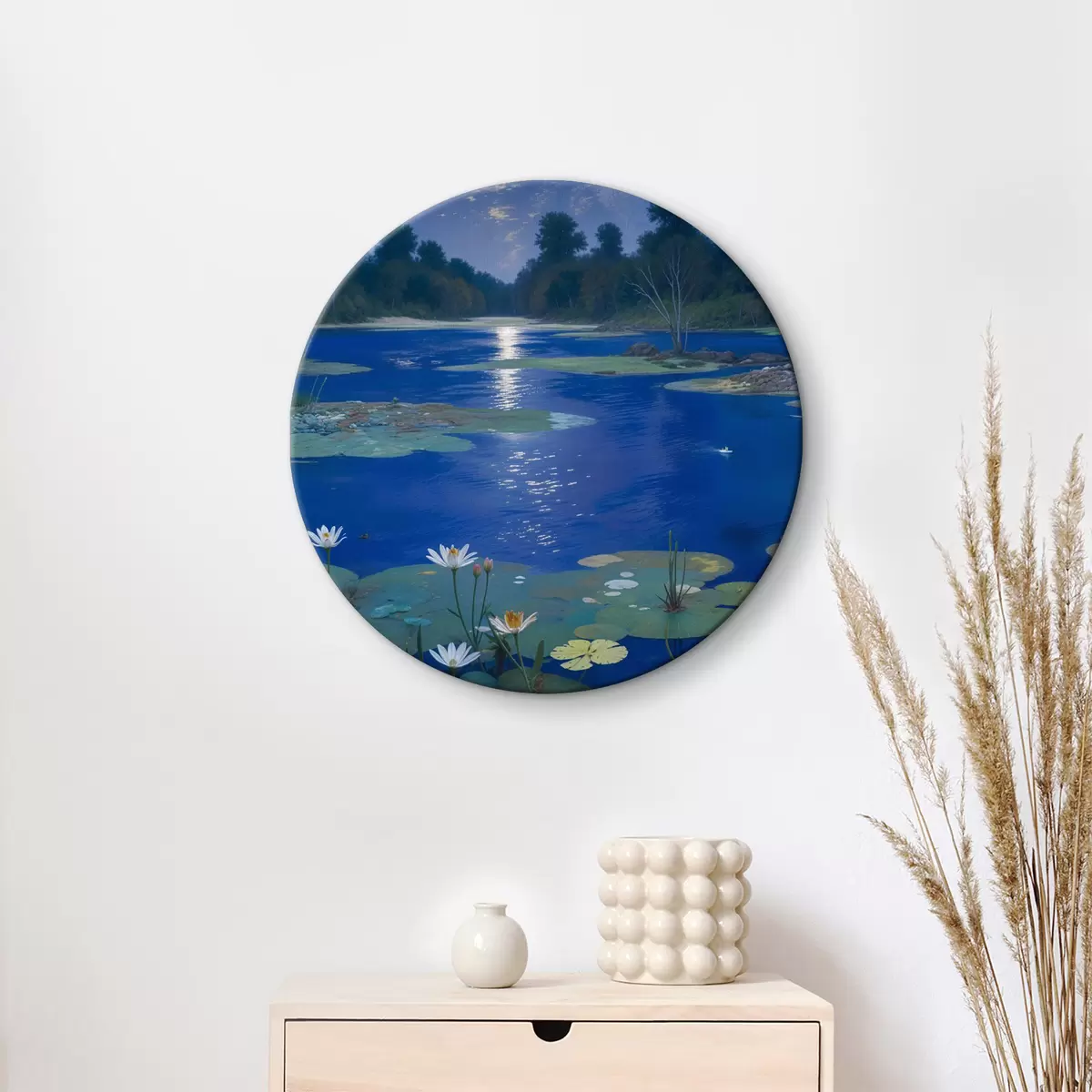 Кругла картина Нічне озеро з повним місяцем, що віддзеркалюється у воді з зеленими деревами та лататтям r39526