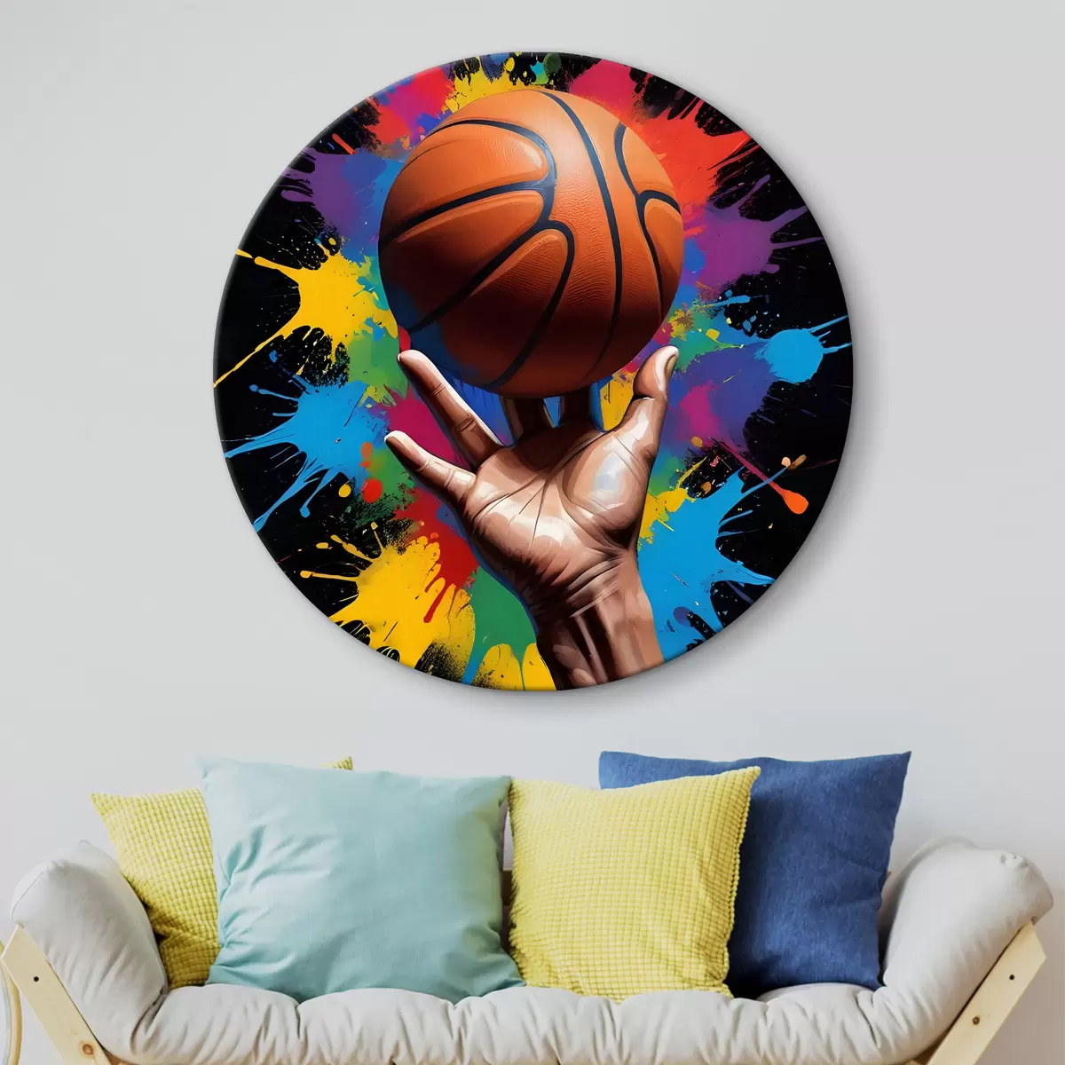 Кругла картина Рука, що тримає баскетбольний м'яч на фоні барвистих бризок фарби Nr r39529