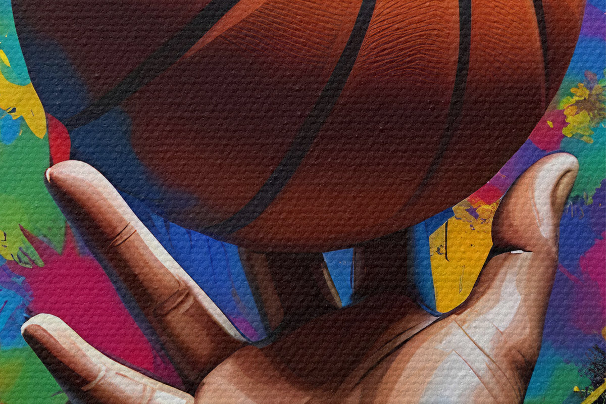 Кругла картина Рука, що тримає баскетбольний м'яч на фоні барвистих бризок фарби r39529