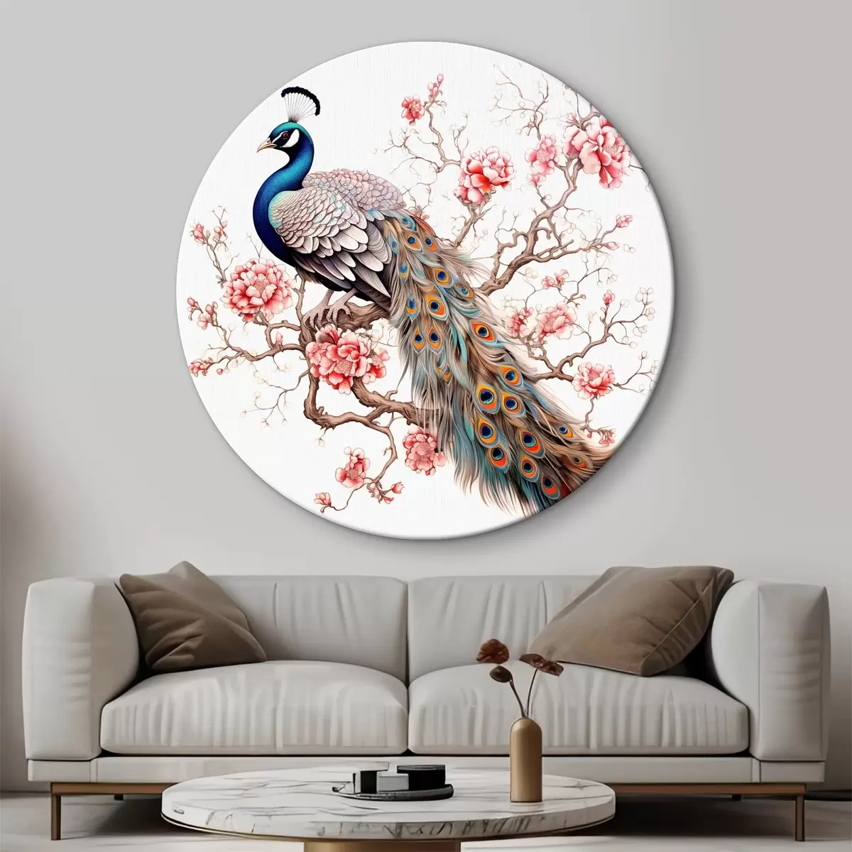 Кругла картина Павич сидить на гілці сакури акварель Nr r39568