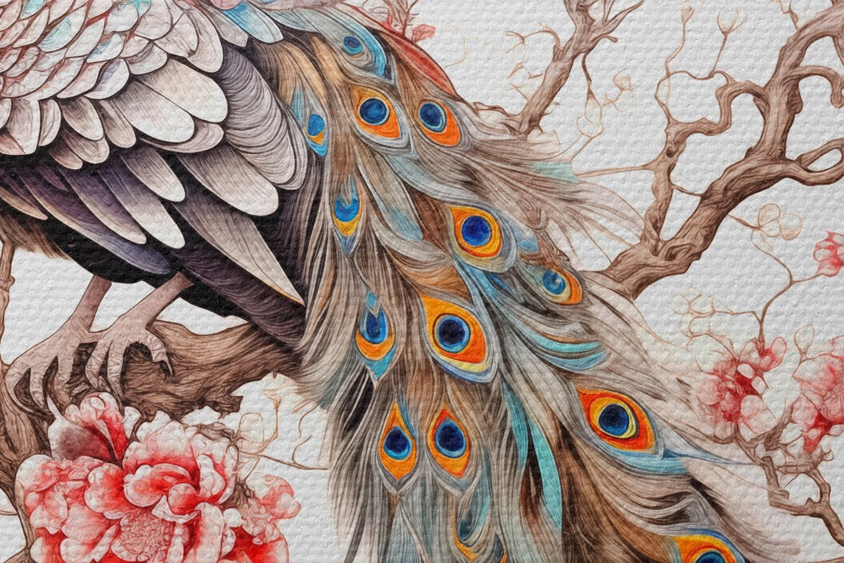 Кругла картина Павич сидить на гілці сакури акварель r39568