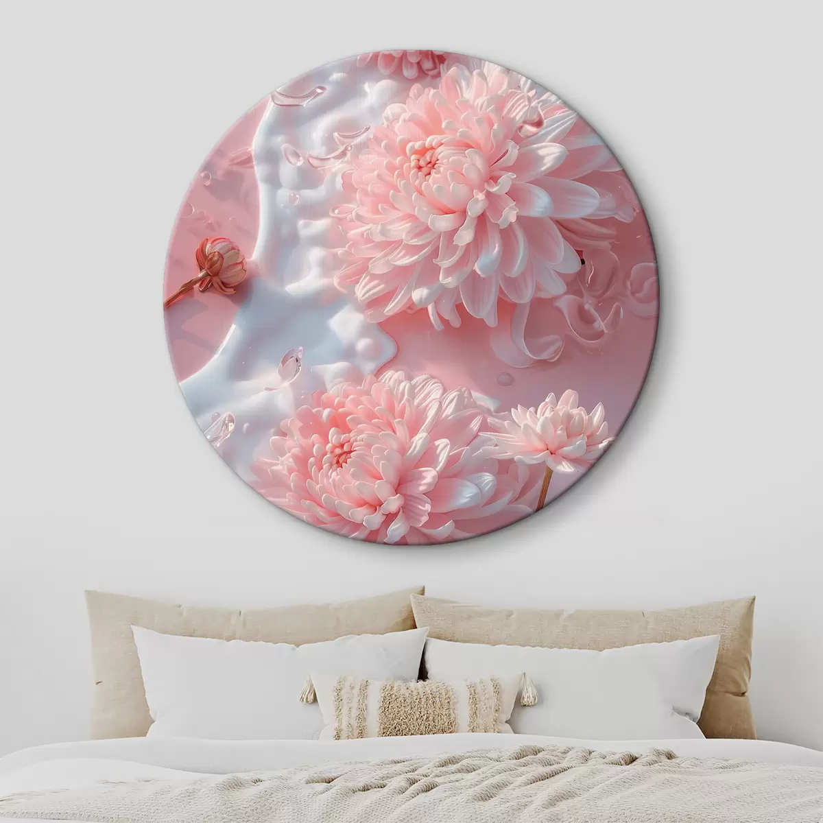 Кругла картина Композиція хризантеми: кілька суцвіть із вкрапленнями молока на рожевому тлі Nr r39640