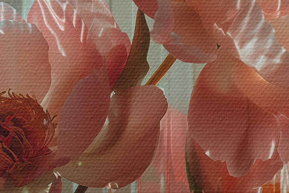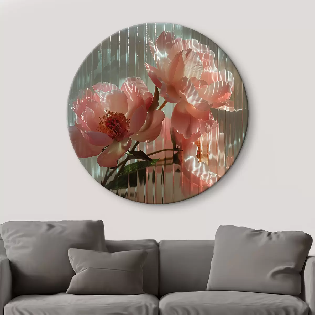 Кругла картина Рожеві півонії видно крізь рифлене скло: фотореалістичний крупний план із спотворенням світла Nr r39648