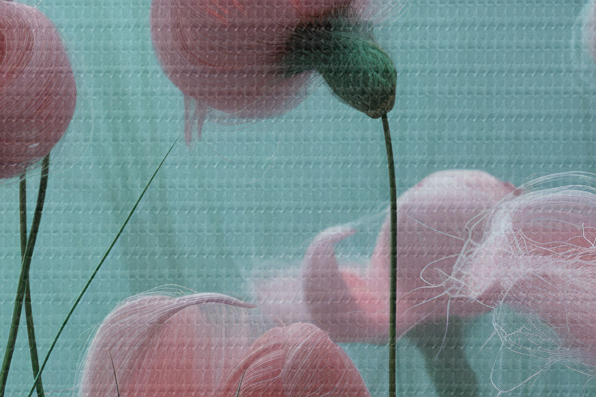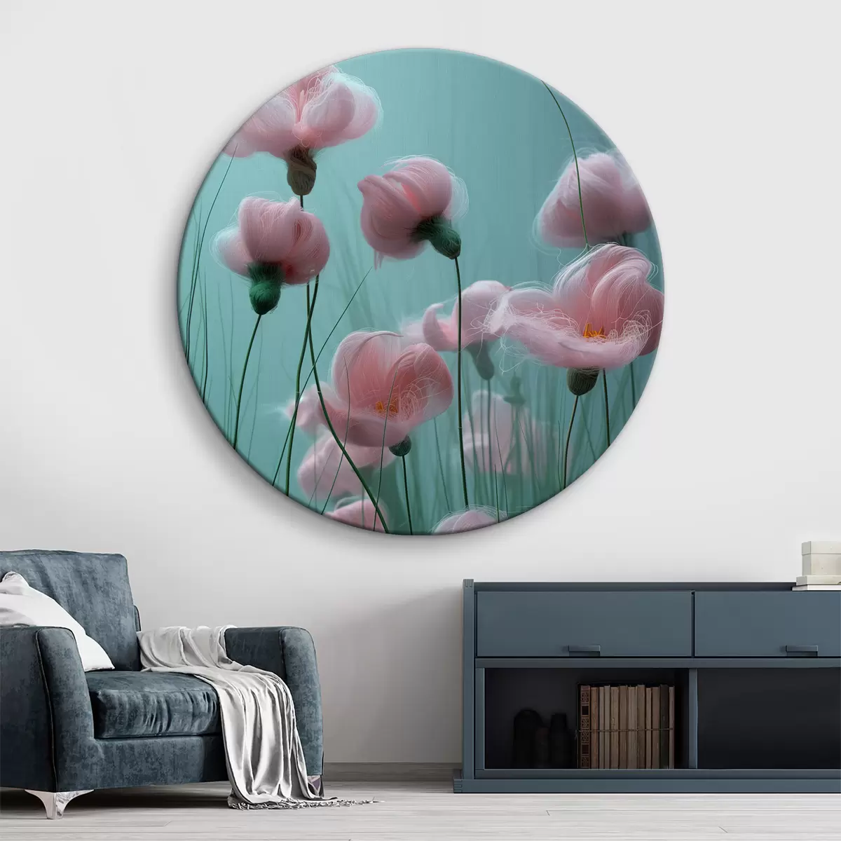 Кругла картина Пухнасті гігантські рожеві квіти з вовни з довгими зеленими кореневищами Nr r39652