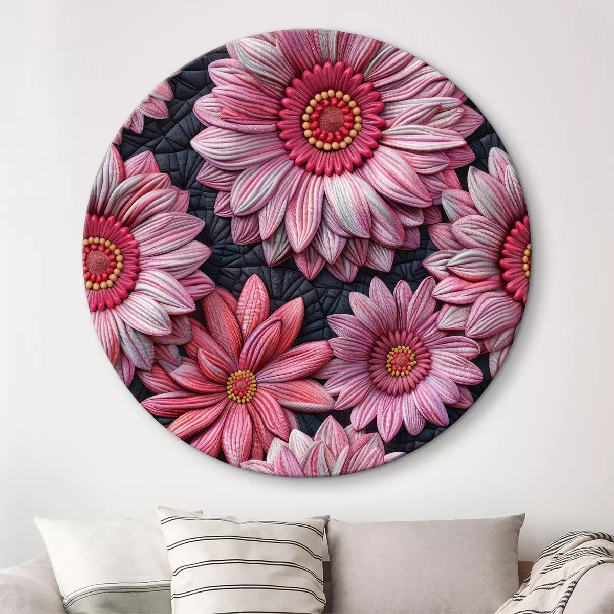 Кругла картина 3D вишивка вовняною пряжею з рожевими герберами на стьобаному фоні Nr r39747