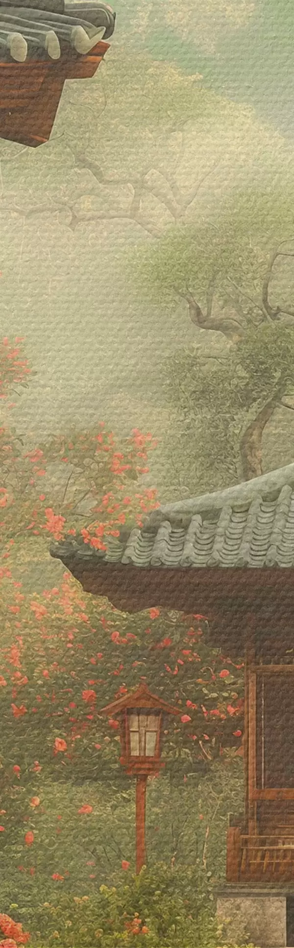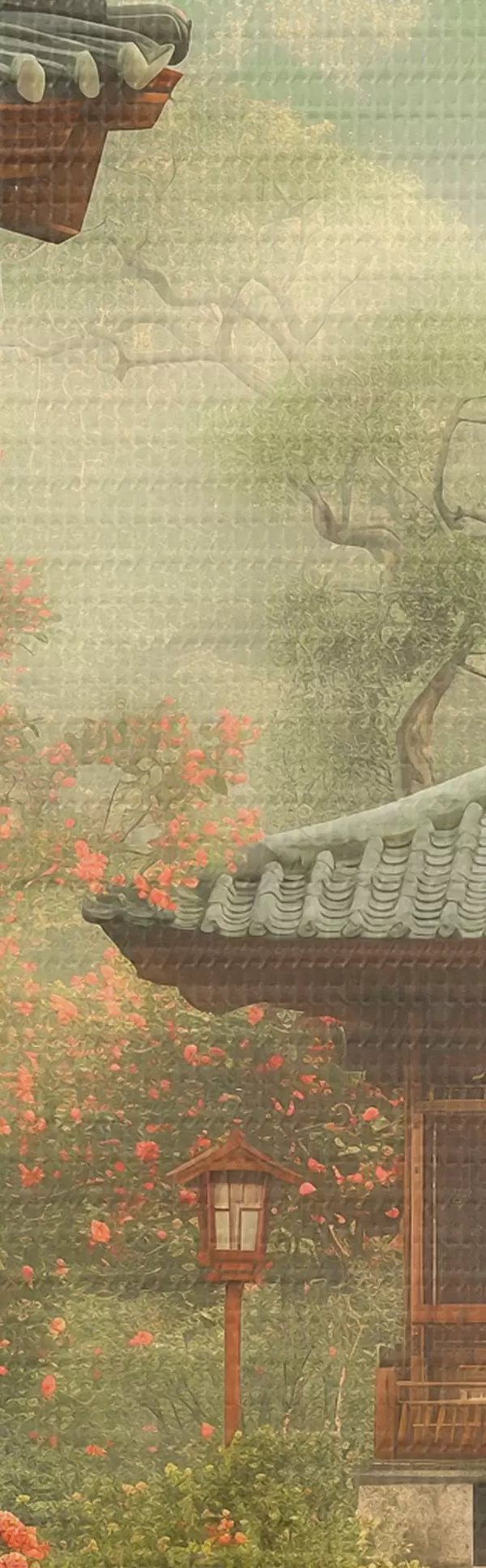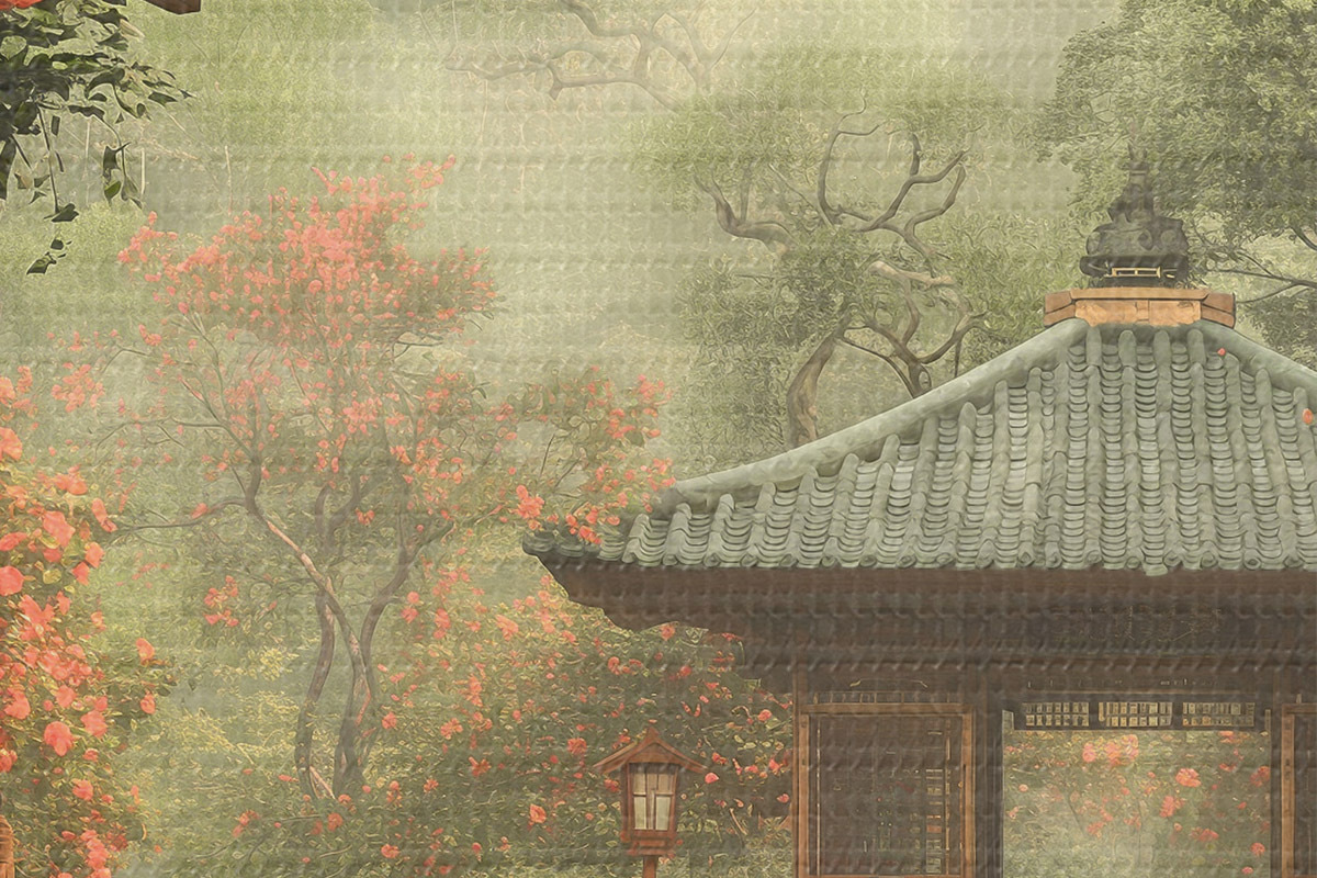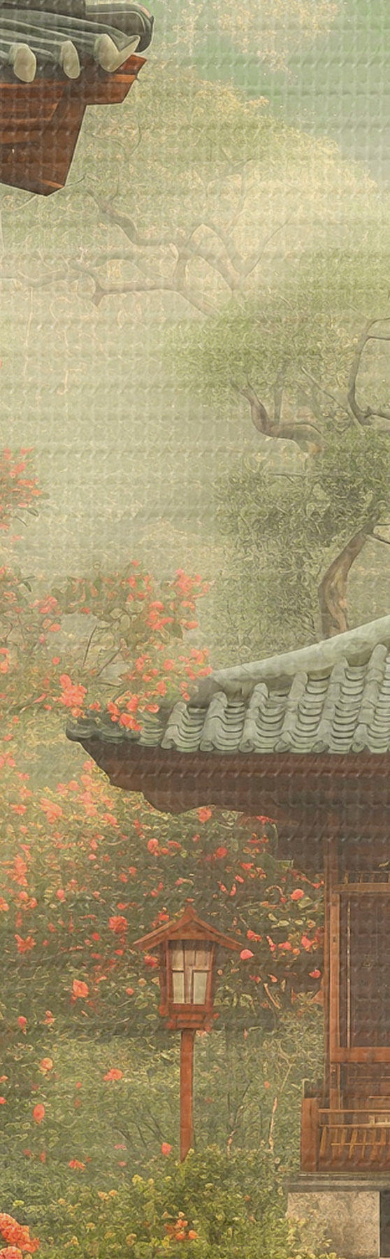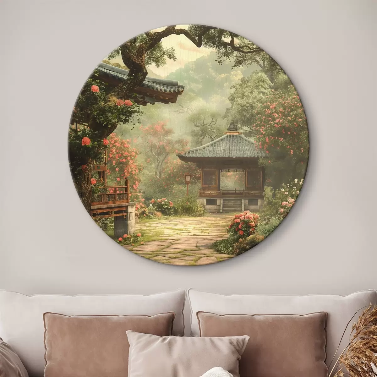 Кругла картина Японський парк з квітучими деревами і квітами, ліс, дерев'яний будинок Nr r39773