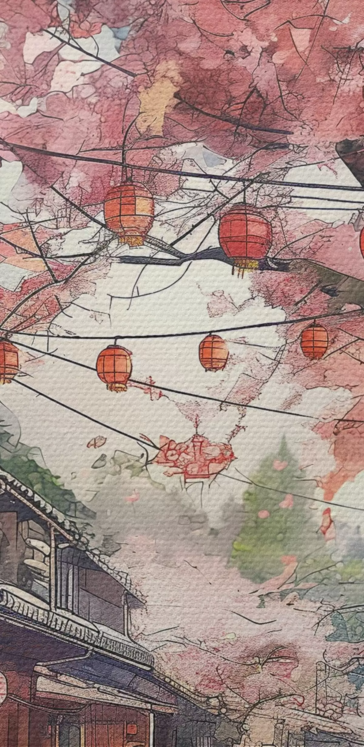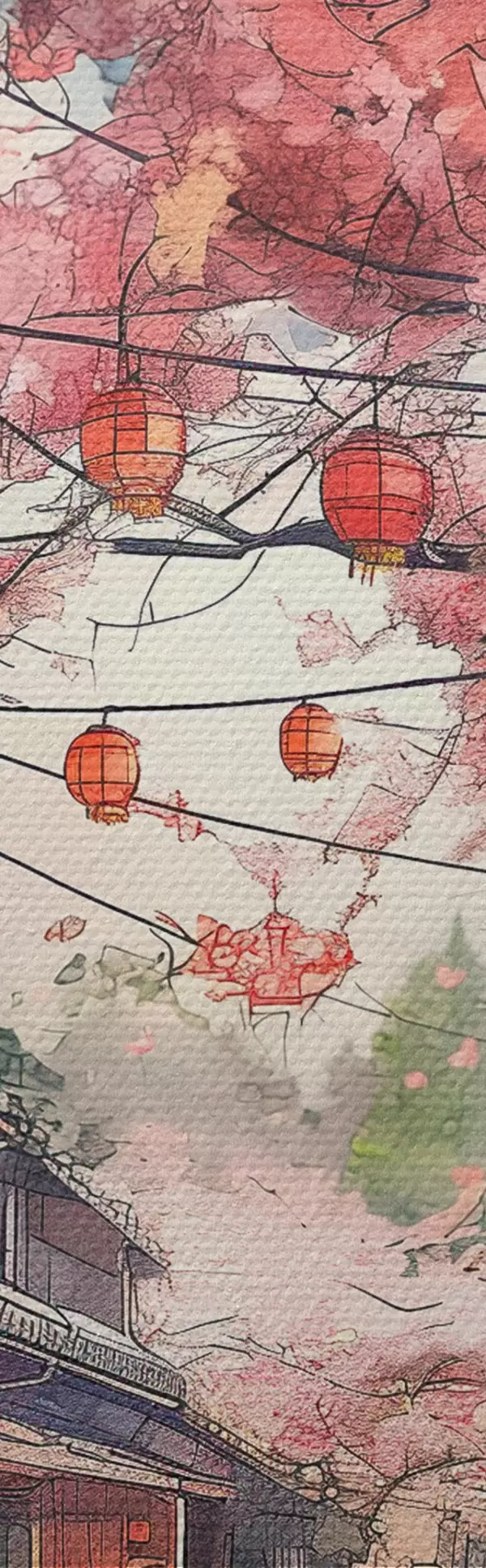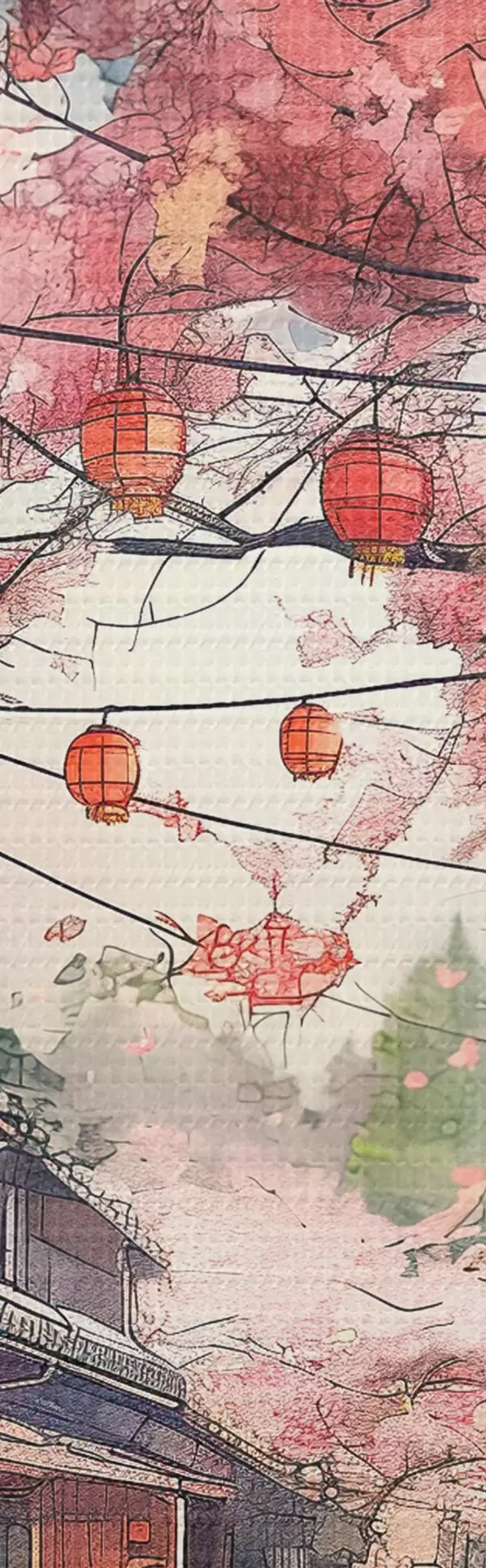 Кругла картина Японська вулиця з квітучими вишневими деревами, східна архітектура, ліхтарі Nr r39774