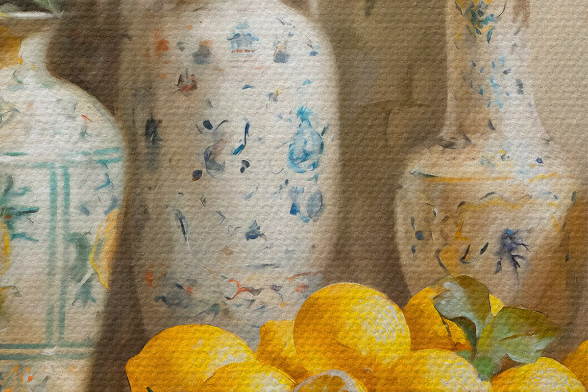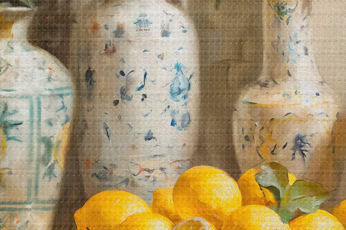 Кругла картина Лимони і старовинні вази на столі Nr r39833