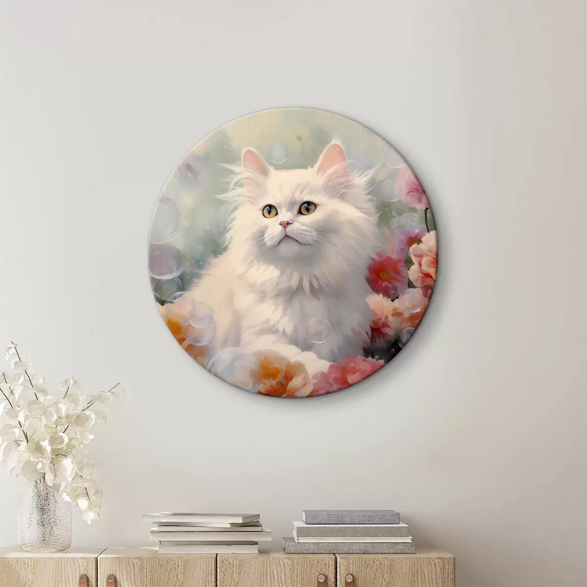 Кругла картина Білий пухнастий кіт у саду квітів і мильних бульбашок аквареллю Nr r39937