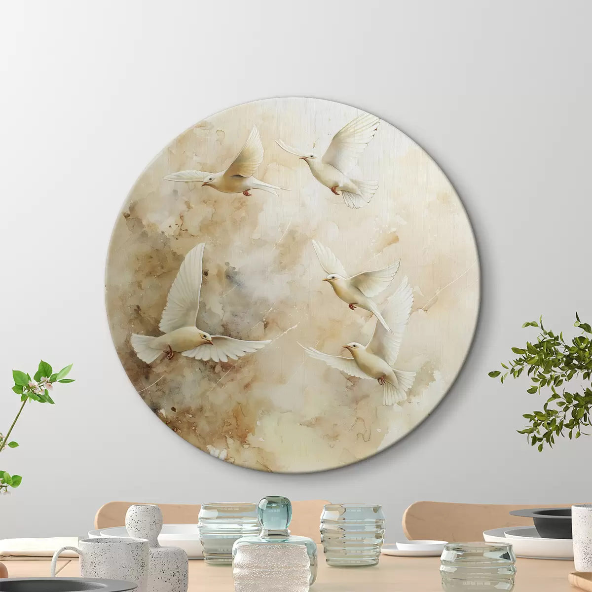 Кругла картина Акварель літаючих голубів, м'який бежевий і білий кольори Nr r39977