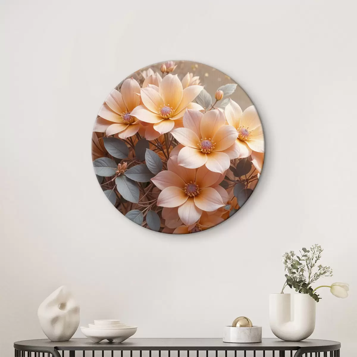 Кругла картина Ніжні квіти жоржин персикового кольору в повному розквіті з м’якими пелюстками на розмитому фоні Nr r40024