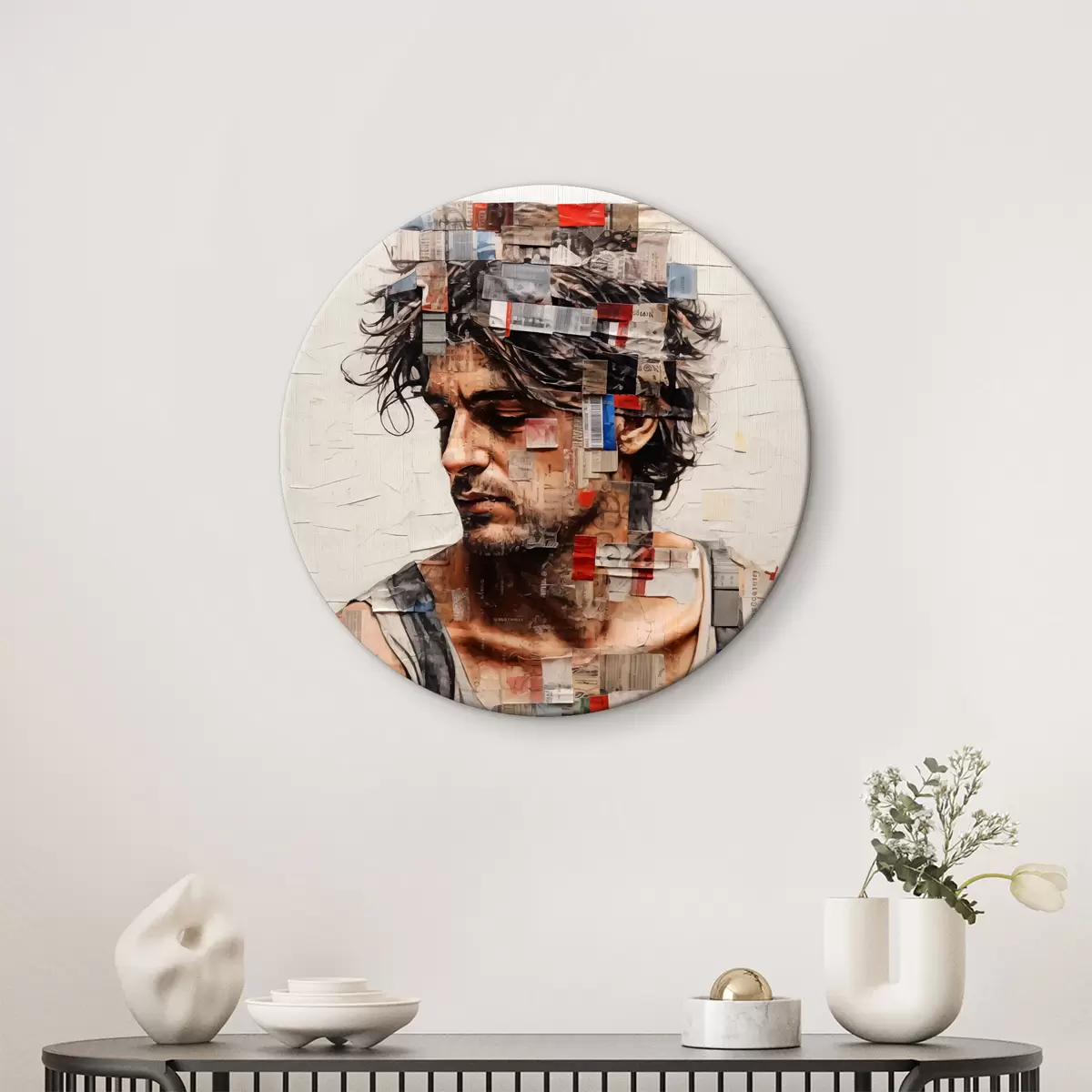 Кругла картина Чоловік із кучерявим волоссям покритий наклейками, марками та штрих-кодом r40103