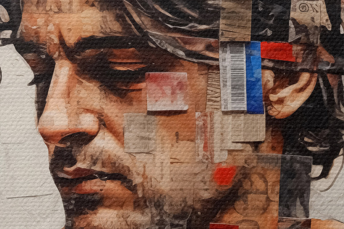 Кругла картина Чоловік із кучерявим волоссям покритий наклейками, марками та штрих-кодом Nr r40103
