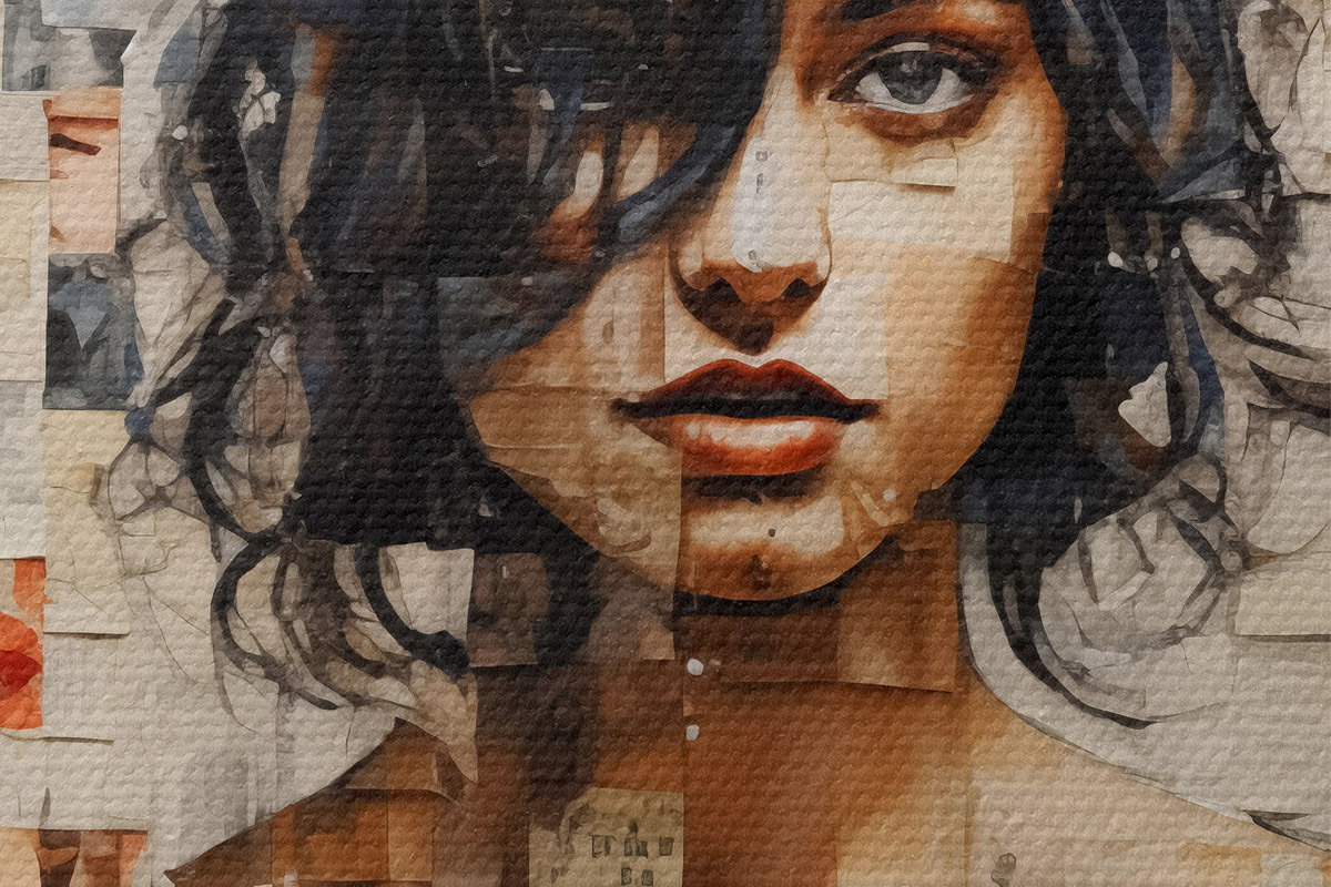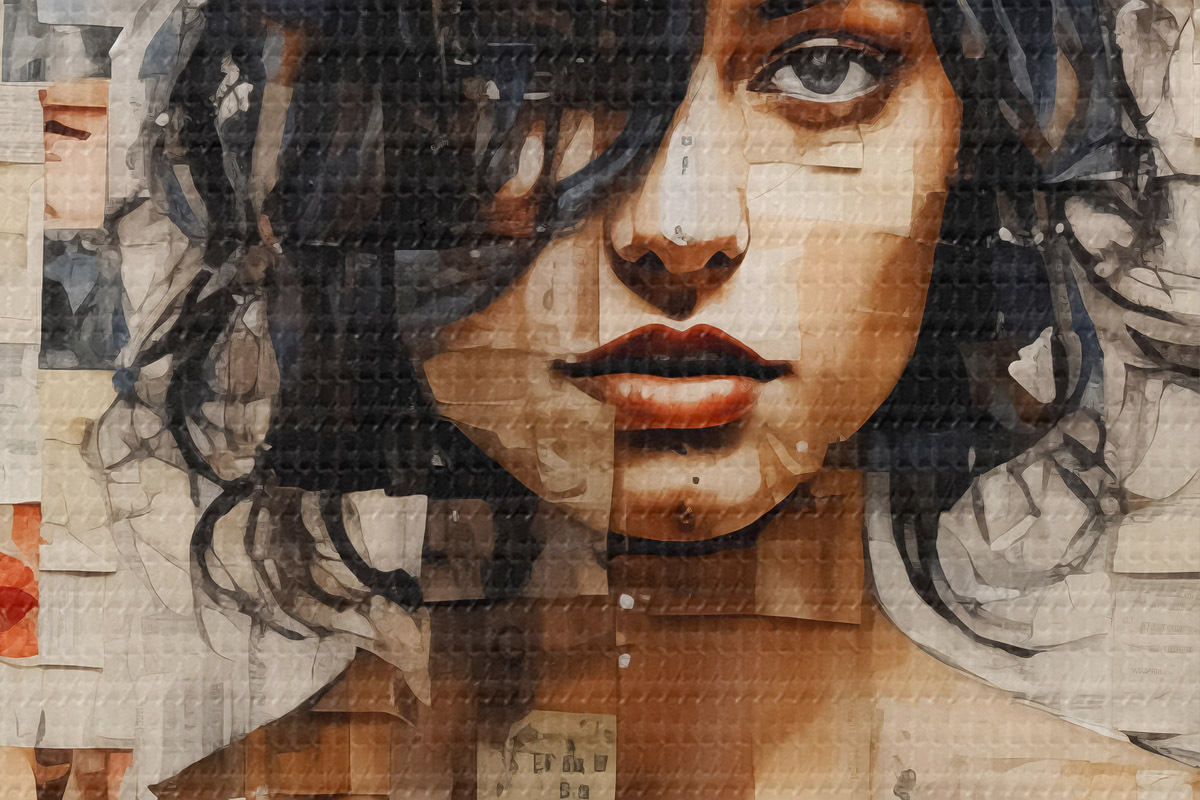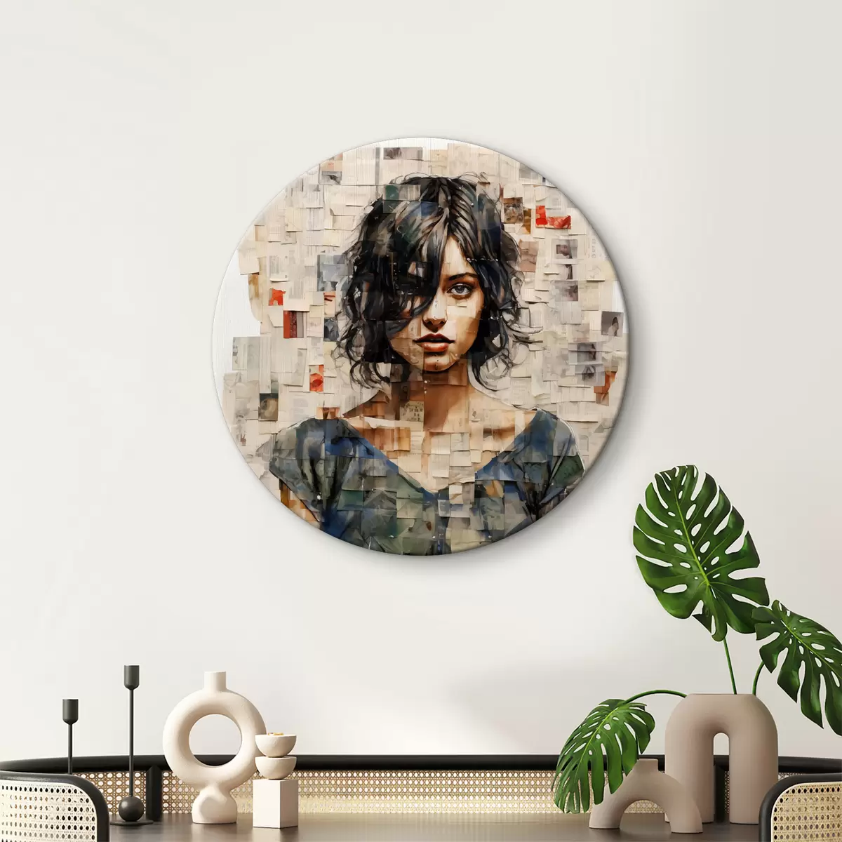 Кругла картина Дівчина з кучерявим волоссям вкрита наклейками, марками та штрих-кодом Nr r40104