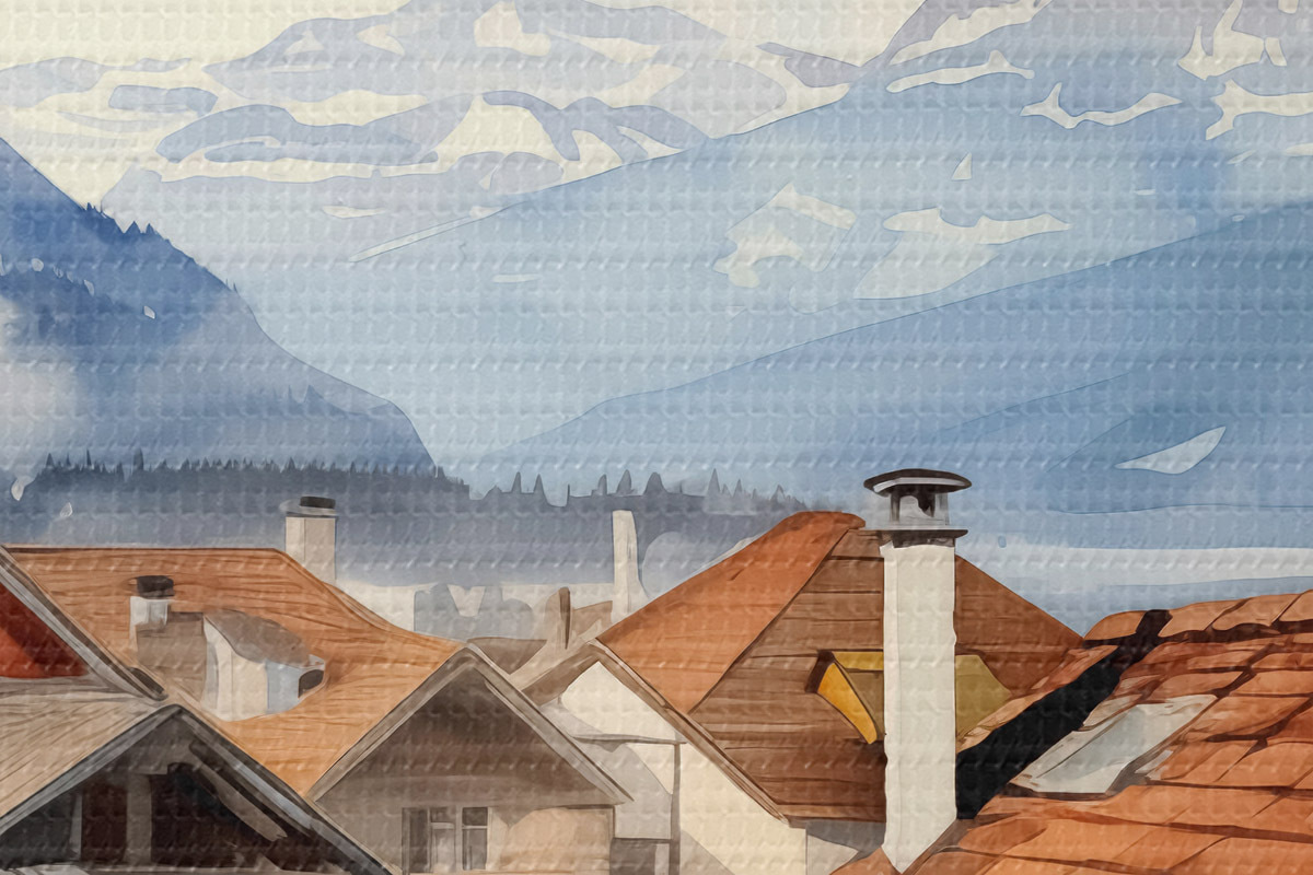 Кругла картина Дахи сільських будинків на тлі гір аквареллю Nr r40107